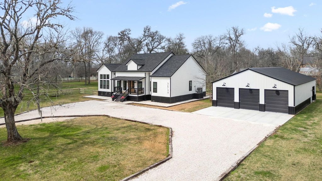 Step inside this stunning Luxury Farmhouse on 1.84 Acres, complete with a massive 2,400 sq ft Workshop, Chicken Coop, 3-stall open Barn with Tack Room, and a whole-house Generator for added peace of mind. This home offers 4 Bedrooms, 3.5 Baths, soaring 14-foot ceilings, and an open floor plan with gorgeous wood-look Luxury Vinyl Plank and decorative tile floors throughout. The chef’s Kitchen features a spacious Island, Quartz countertops, 8x12 subway tile backsplash set in a herringbone pattern, a 6-burner ZLINE stainless steel gas range, and a farmhouse porcelain sink. The bright Primary Suite boasts abundant windows and a Spa-like Bath. Enjoy covered front and back porches, a circular driveway, a newly installed three-board horizontal fence, and expansive outdoor space perfect for a garden, kids’ sports, a pool, or horses. Just minutes from Fulshear, grocery stores, restaurants, and shopping, this home blends the ultimate country lifestyle with modern luxury and a low tax rate.