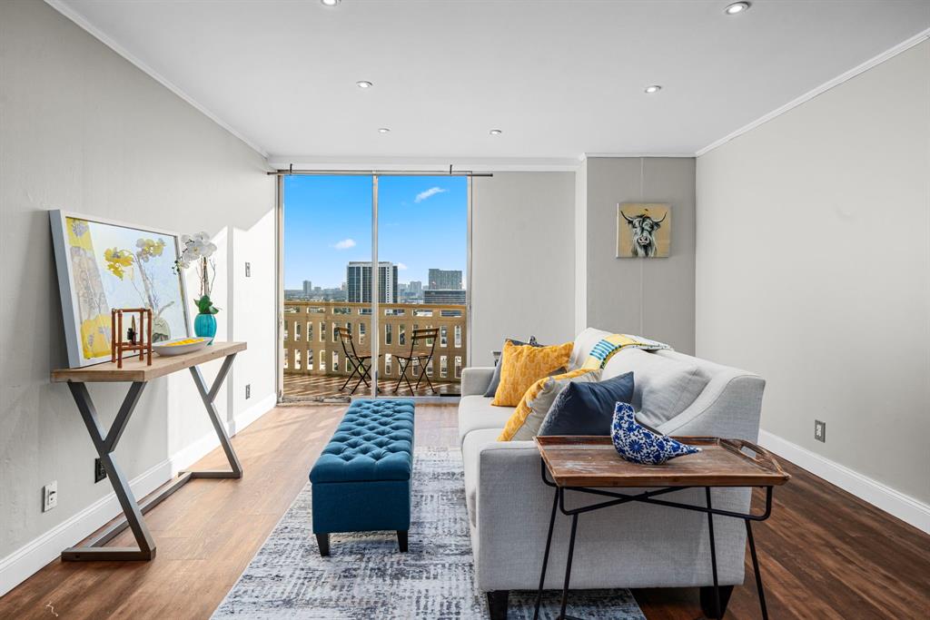 Updated 1 bedroom on the 20th floor with SOUTH views (Texas Medical Center) and 2 balconies and non freeway facing! Wood look flooring throughout, living/bedroom/bathroom recently painted, brand new kitchen and updated bathroom (2024). You will love the generous amounts of natural light this unit receives. HOA includes ALL utilities, as well as internet. 24/7 manned entry, with on-site amenities that include an updated gym, community banquet room, sun deck and lounge. Reserved parking + storage cage. Walkable to Downtown Houston's food halls, arts and entertainment scene...as well as those in Midtown. Great sunset views from your balcony. Welcome home!