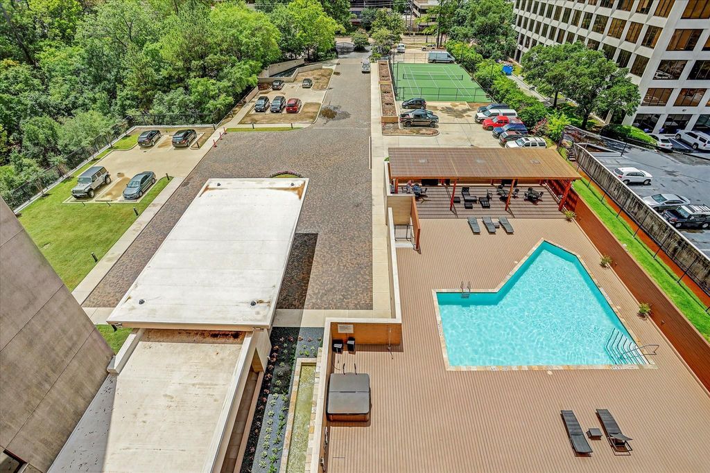 Step inside this spacious 2-bedroom condo with gorgeous wooded views, herringbone hardwood floors, and tasteful finishes. A well-appointed kitchen features granite countertops, stainless steel appliances, and a designated breakfast table area with a private patio. The easy living floorplan flows into an open living and dining room, with windows overlooking a lush ravine and creek, and a large private patio where one can enjoy the outdoors without the noise of the city. A spacious primary suite boasts an extra bedroom/study and a bathroom with travertine tile finishes and a walk-in closet. Residents at the Park Square Condos enjoy a wide suite of amenities, from a full-sized tennis court to an on-site concierge and security team. Other resident amenities include a fitness center, indoor hot tub, a spacious pool area with areas to lounge in the sun and grill delightful meals in the shade, al-fresco dining areas, and party rooms that can be reserved for events. This building is fantastic!
