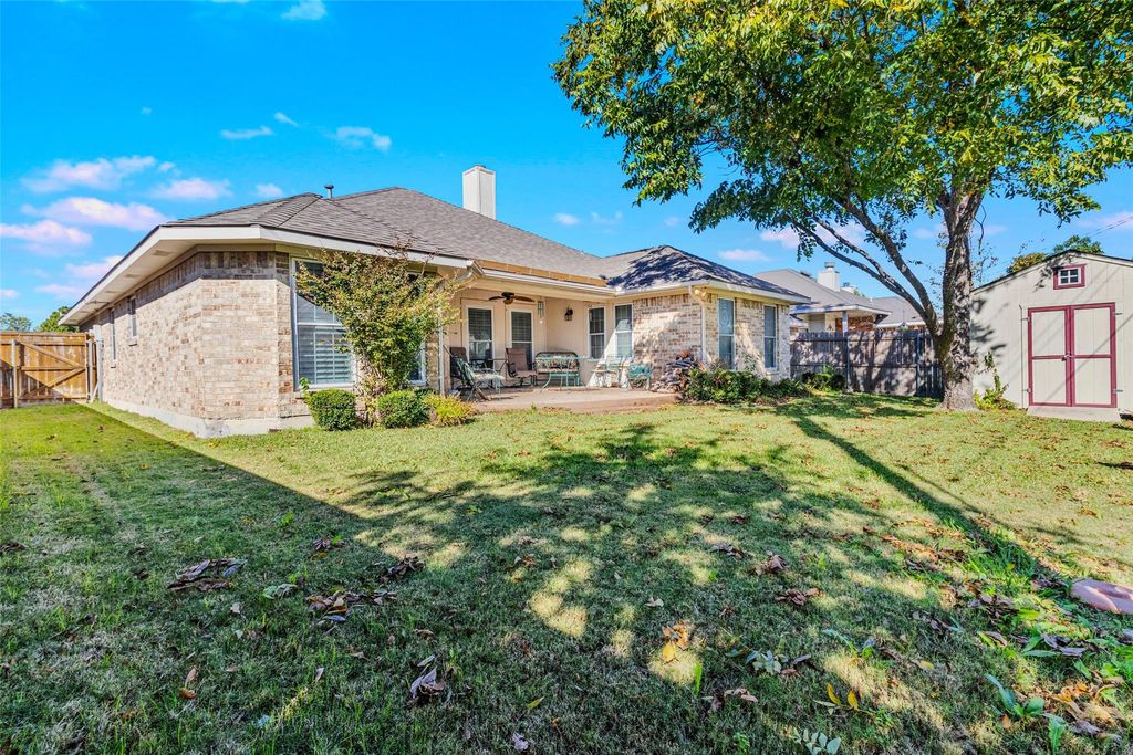 WELCOME HOME! Lovingly cared for and nestled in an established neighborhood with NO HOA, this charming property offers a perfect blend of comfort, character, and thoughtful updates. With a new hot water heater replaced in February and numerous recent improvements, this home is truly move-in ready. Featuring 3 spacious bedrooms and 2 bathrooms, the home provides ample room for comfortable living. Step inside to an open floor plan that seamlessly connects the living area, kitchen, and bedrooms, enhanced by crown molding, engineered hardwood flooring, and elegant plantation shutters. The inviting living room centers around a cozy fireplace, flanked by beautiful built-ins and accented with recessed lighting that adds warmth and charm. The kitchen serves as the heart of the home, complete with a breakfast bar and a lovely dining area with plenty of space for a hutch. A convenient rear mudroom sits just off the kitchen near the laundry area, adding both function and practicality. The large primary suite offers room for a sitting area and features a huge walk-in closet along with a remodeled en-suite bath showcasing granite countertops, a separate walk-in shower, and a relaxing jacuzzi tub. Additional recent updates include updated windows with blackout screens, and fresh, neutral paint throughout. Step outside to enjoy a beautiful backyard with a covered patio, private fencing, a greenbelt view, and a storage building—perfect for outdoor living and entertaining. The 2-car garage includes an additional closet ideal for freezers or extra storage, and a sprinkler system adds convenience to lawn care. Centrally located near schools, shopping, and recreation, this home combines charm, functionality, and location—making it an exceptional opportunity you won’t want to miss.