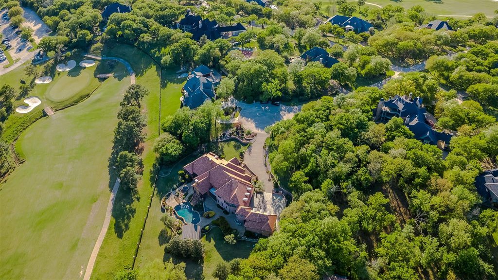 The perfect marriage of rustic warmth and refined elegance, this exceptional cul-de-sac estate sits on nearly two acres, backing to the golf course with sweeping, scenic views. Designed for both everyday living and unforgettable entertaining, the resort-style backyard features an infinity-edge pool with dramatic rock waterfall elements, all surrounded by lush, manicured landscaping that creates a true private retreat within this exclusive 24-7 guarded and gated community. Inside, the home offers a fabulous layout with the majority of bedrooms on the main level. Upstairs, a private suite off the bonus room opens to a balcony with breathtaking views, creating the perfect escape for guests or multigenerational living. A separate guest apartment with its own entrance, kitchenette, and comfortable accommodations serves as a fifth bedroom and offers ultimate flexibility. Entertainment is effortless with media and game rooms conveniently located on the main floor. Car enthusiasts will appreciate the six-car garage and expansive motor court with a remote-controlled gate. Even the details have been elevated, including a heated and cooled 17-foot dog kennel in the garage and a dedicated dog wash station in the utility room. Located in award-winning Argyle ISD and just minutes from DFW Airport, this property offers a rare combination of privacy and accessibility. For those seeking a property that exceeds their expectations, this is the one.