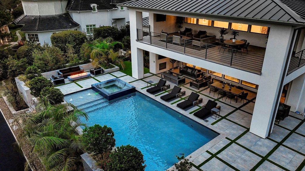 Exquisite contemporary custom built home in 24-hour guard gated Carlton Woods Nicklaus! Located on a .65-acre lot, with a gated entry, circular drive, and 4 car garage, this exceptional home is both elegant and inviting. Dual glass and iron entry doors lead you inside, where you'll notice impressive ceiling heights with decorative wood beams that add warmth and dimension, as well as stunning light fixtures. A decorative wine wall lights up to display your favorite vintages, and a media and game room downstairs means they'll get plenty of use! The sleek and functional kitchen with waterfall leathered granite island offers plenty of cabinet storage and prep space, and opens to the breakfast and family rooms, with enormous windows overlooking the private backyard. Primary bedroom suite and guest bedroom down; 3 bedrooms with en-suite baths, an enormous balcony, and a bonus room up. Resort-like backyard has a heated pool and spa, outdoor fireplace and sports court, with tons of privacy!
