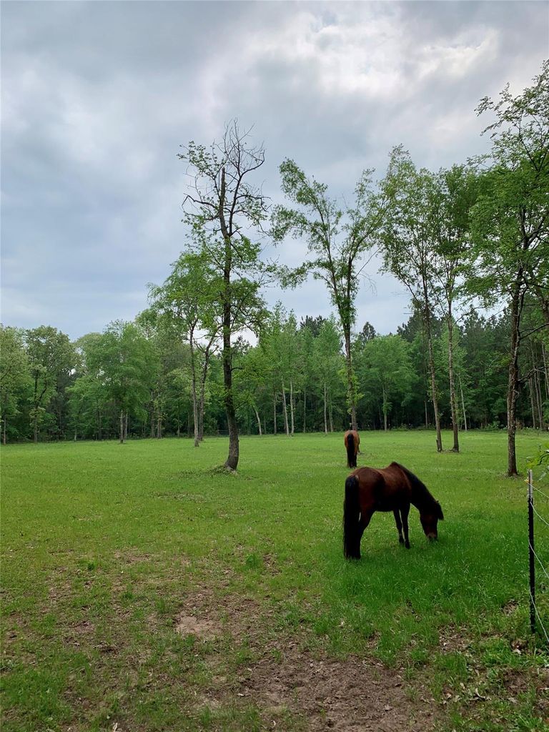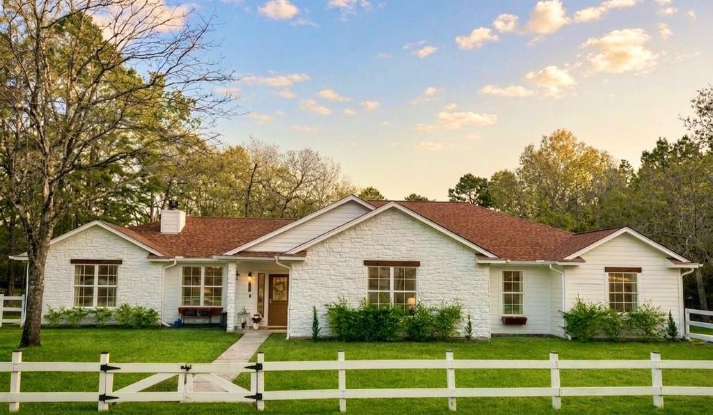 Imagine waking up to wide open skies and peaceful country views on nearly 10 acres of your own land. This fully remodeled and expanded one-story home blends modern upgrades with country living. A ~1,000 SF addition creates a spacious 5-bedroom layout with a large game/family room, 3.5 baths, and home office. The kitchen offers quartz countertops, custom cabinetry, farmhouse sink, and SS appliances. Includes a two-stage HVAC system and whole-house generator. Outside, enjoy a large covered porch, cross-fenced pasture, three horse stalls, chicken coop, garden, duck pond, cleared and wooded areas, plus a creek at the back adding natural beauty and play. Ideal for homesteading and privacy, 20 miles from The Woodlands. A 32’x62’ metal shop on slab with 12’ rolling door for equipment/workshop needs. Over 8 acres are outside any floodplain, Harvey was a non-event for sellers. Conveniently located near grocery, dining, and everyday amenities in a rapidly expanding area of Montgomery County.