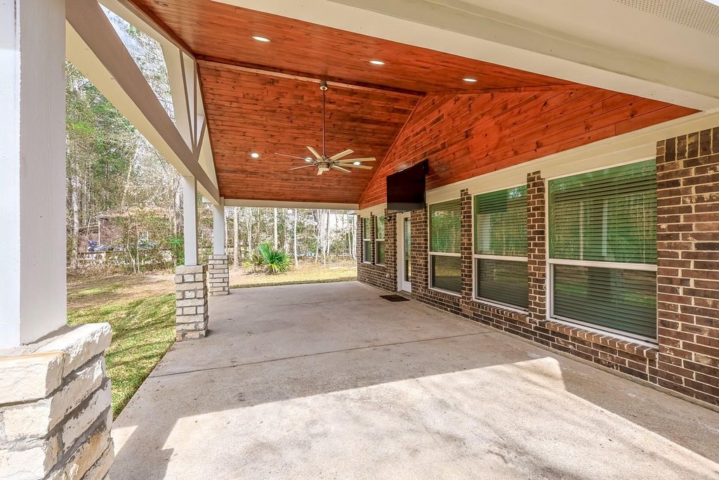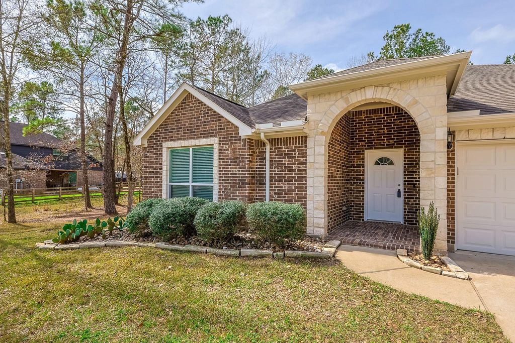 4 bedroom 2.5 bath with attached three car garge on a 1-acre wooded lot, zoned to Montgomery ISD. Island kitchen with granite countertops, farmhouse sink and stainless steel appliances that is open into the dining area and spacious family room with a brick wood burning fireplace. Split floor plan that seperates three bedrooms and guest bath from the Primary bedroom with ensuite that includes a jetted soaking tub and seperate shower. Large laundry room that is accessed from the garage that has plenty of space to create a mudroom/drop space as you enter the home. Flex room that could be used for an office/dining/ gameroom/possible 5th bedroom. Large covered back patio with propane gas hook up that looks out to a partially wooded backyard with plenty of space for your future pool/shop or playground. Enjoy quiet country living by calling this well maintained property home!