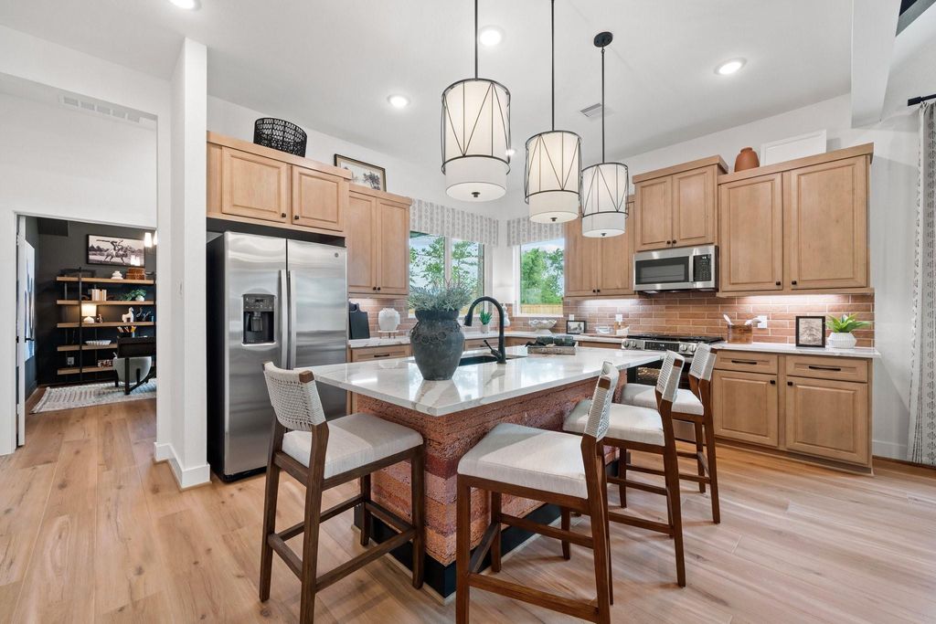 GREENSPACE IS YOUR REAR NEIGHBOR! This gorgeous 1-story with lofty ceilings defies the technical square footage, making it easy & fun to entertain in! 3 Bedrooms, 2 Bathrooms, Covered Patio + 2 Car Attached Garage. Sprawling space includes luxury Quartz Island at Kitchen with seating for 4, a chic electric fireplace at Family Room, and large Casual Dining. Split Bedroom Plan allows for a privacy. Spacious Owner’s Suite w/ Attached Bath is complete with Double Sinks, Soaking Tub, Separate Glass enclosed Shower, Linen Storage + Large Walk-thru Closet giving direct access to the Laundry Room. Convenient Drop Zone and Additional Storage entering off Garage. Caring features with your health in mind include: Reverse Osmosis at kitchen sink, Whole-Home Water Softener Prep, Hospital-Grade Air Filtration, Smart Home Automation, Stainless Appliances, 2" blinds, Wood-look Tile Flooring, Smart Garage Door Opener, Sprinkler System, Fully Sodded yard, FULL GUTTERS and much more!