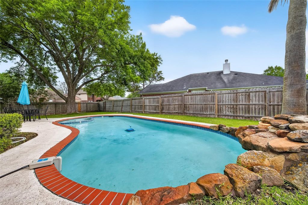 Beautiful home on a corner lot with no front neighbors! 4-beds, 2.5 baths, primary bedroom is downstairs, formal dining area or it could be a study, plus a gameroom up. Private pool & built-in hot tub in the backyard, complete with a mature palm tree and rock waterfall. Granite countertops in the kitchen and a breakfat bar. 2 inch blinds and lots of nice touches throughout. Home has been well taken care of.Conveniently located close to shopping centers with easy access to I-69 or ALT 90. Come check it out today! There is an additional $160 a month for pool care.