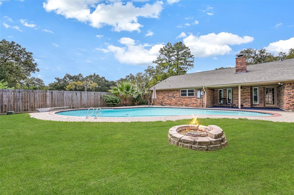 Beautiful & updated single-story 4-bedroom home with a pool, tucked amongst towering moss-draped trees on a park-like winding creekside road in Wedgewood Village! Located on a sprawling corner lot, this inviting abode boasts stylish luxury vinyl plank floors, neutral paint, energy-efficient double-paned windows, and modern lighting extending throughout the formal living & dining rooms and into a spacious family room anchored by a vaulted ceiling and a charming brick fireplace. The light & bright kitchen features granite countertops with bartop seating space, white cabinetry with soft-close drawers, and a full suite of stainless appliances, including a convection oven & 5-burner cooktop. The bedrooms & closets are generously sized, both bathrooms have been stylishly renovated, & the indoor utility room has space for a bonus fridge. Outdoors, a covered patio overlooks the large in-ground pool & firepit area. Additional updates include a new roof in 2022 & a new air handler.