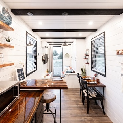 Modified Plumbing: If your tiny house is mobile, your unit will have water tanks and most likely a toilet that is waterless or is smart composting—similar to what you’d find in a RV trailer. Tiny houses built on foundations on their own lot have more options to get water/sewer hook-ups.