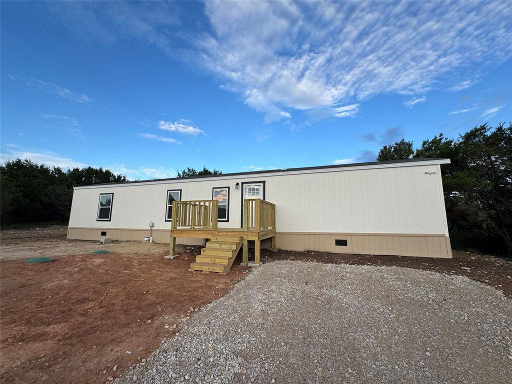 Brand new 3-bedroom, 2-bathroom Cavco home located on a double lot in Comanche Cove, Granbury. Home is set on an engineered concrete foundation designed for long-term durability. Features an open-concept floor plan with modern finishes throughout. Property is eligible for FHA and VA financing. Conveniently situated just minutes from Lake Granbury with access to community amenities.