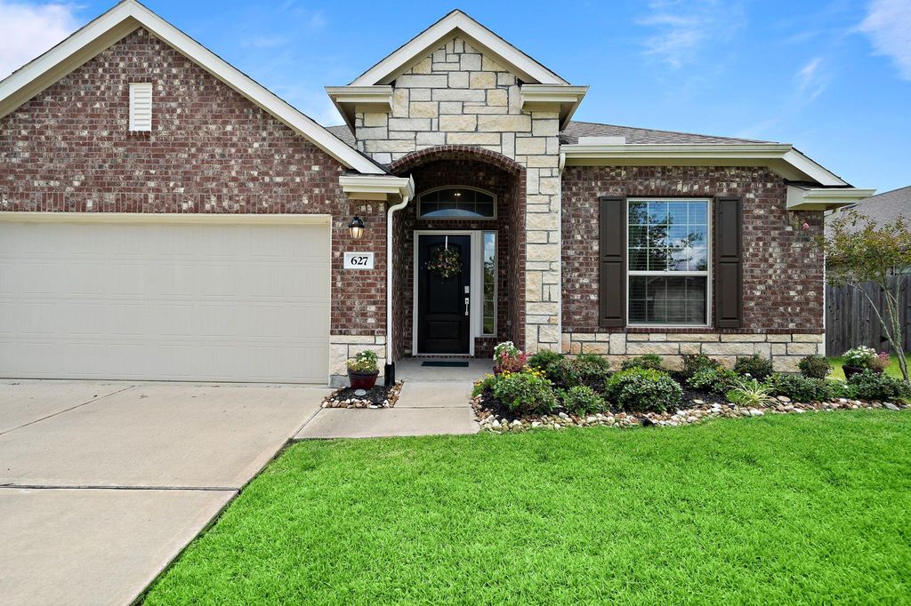 Welcome to 627 Harbor Colony Lane- an inviting 2020-built, 1,800-sq-ft single-story in Delany Cove! This 3-bed, 2-bath layout centers on an open family room that flows into a kitchen/dining combo with a breakfast bar, high ceilings, and a mix of tile and brand-new carpet. The kitchen features a dedicated water-filtration system, and both baths are outfitted with water-filter shower heads for everyday comfort. The private primary suite includes an en-suite bath and walk-in closet, while two secondary bedrooms share a full bath. Thoughtful upgrades add peace of mind and easy living: attachable storm shutters, an automatic underground irrigation system, and included refrigerator and window coverings for a true move-in feel. Outside, enjoy the brick exterior, fully fenced backyard, and a 2-car attached garage with a double-wide driveway. Community Park access and a convenient La Marque location round out effortless day-to-day living.