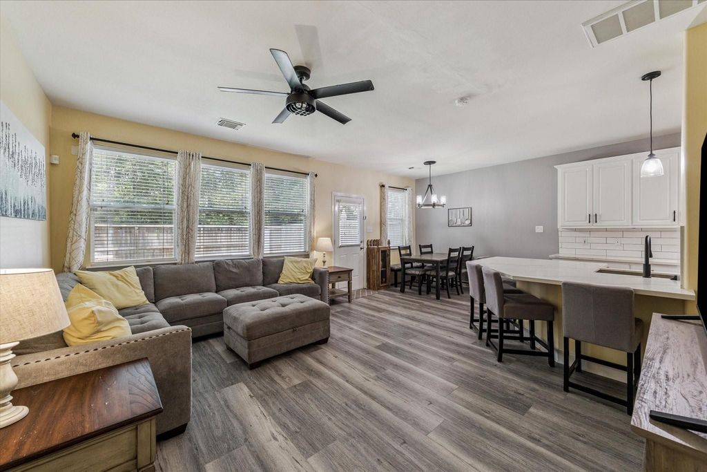 Welcome to this beautiful open-concept townhome featuring a cozy family room with a large window that fills the space with natural light. The updated kitchen offers quartz countertops, a subway tile backsplash, updated stainless steel appliances, and the refrigerator stays. Perfect for entertaining, the kitchen opens directly to the family room. The spacious primary suite features dual sinks, a large soaker tub, and a separate shower. Guest bedrooms each have walk-in closets, and there is a loft-style office that is ideal for working from home. Enjoy peace of mind with the AC unit replaced just 2 years ago. Plus, no backyard neighbors for added privacy. This home blends comfort, function, and style in a fantastic layout. Don't miss it!