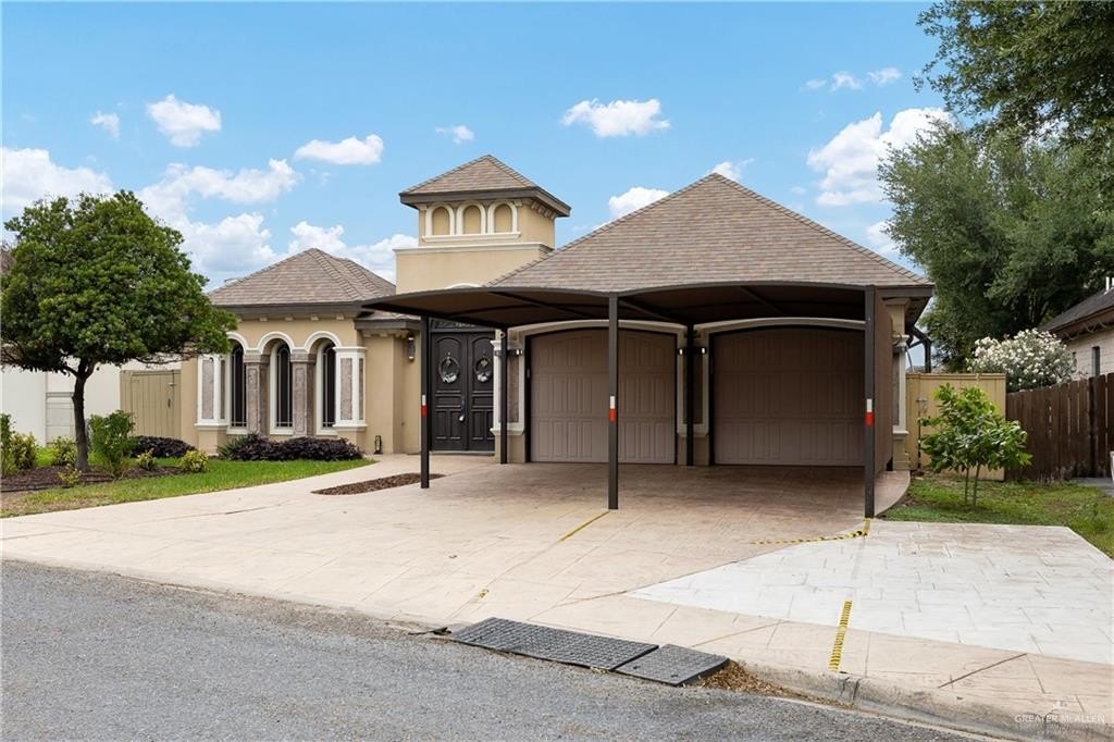 This spacious 3-bedroom, 3.5-bath home in Hidalgo seamlessly blends space and lifestyle. Designed with a split-bedroom layout, each room feels like its own private suite, featuring walk-in closets and double vanities. The restroom sinks are crafted from travertine stone, offering a level of quality and detail that stands out. The primary bathroom is designed for relaxation, complete with a large walk-in shower, double vanity, and a soaking tub perfect for unwinding at the end of the day. Step outside to a welcoming courtyard ideal for entertaining, featuring an industrial exhaust fan, built-in grill, covered patio, and a refreshing diamond-shaped in-ground pool. The backyard offers ample space for pets and outdoor activities, and includes a storage shed for added convenience. Additional highlights include a 2-car garage and all appliances included washer and dryer as well making this move-in-ready home a standout opportunity. Come see it for yourself!
