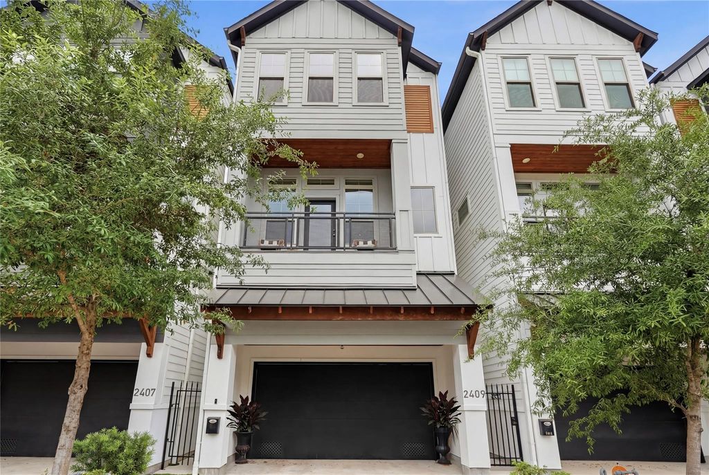 Beautiful modern farmhouse in the desirable Greater Heights featuring a rare private driveway and high-end finishes that stand out immediately. Engineered hardwood floors and soaring ceilings lead into a bright, open living and dining space. A statement chandelier anchors the area. The designer kitchen showcases Calacatta quartz, stacked backsplash, and two-tone cabinetry. Bold black hardware, a waterfall island with a wine fridge, and a premium KitchenAid refrigerator add luxury. Enjoy Sonance in-ceiling speakers throughout, smart home tech, dimmable lighting, and motion-activated stair lighting. Elegant gray velvet drapes and solar-powered blackout shades offer further upgrades. The vaulted primary suite is a sanctuary, with a spa-like bath, freestanding soaking tub, seamless glass shower, full-height tile, and dual closets. Outside, a lush, low-maintenance yard features professionally installed turf. All in a prime location near MKT, Heights Trail, top dining and coffee spots!