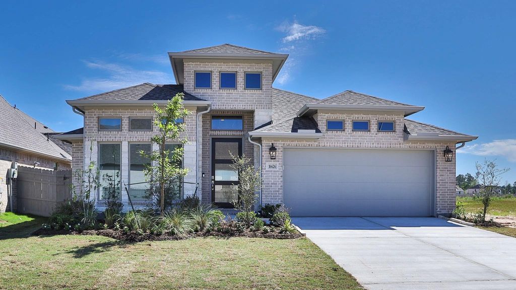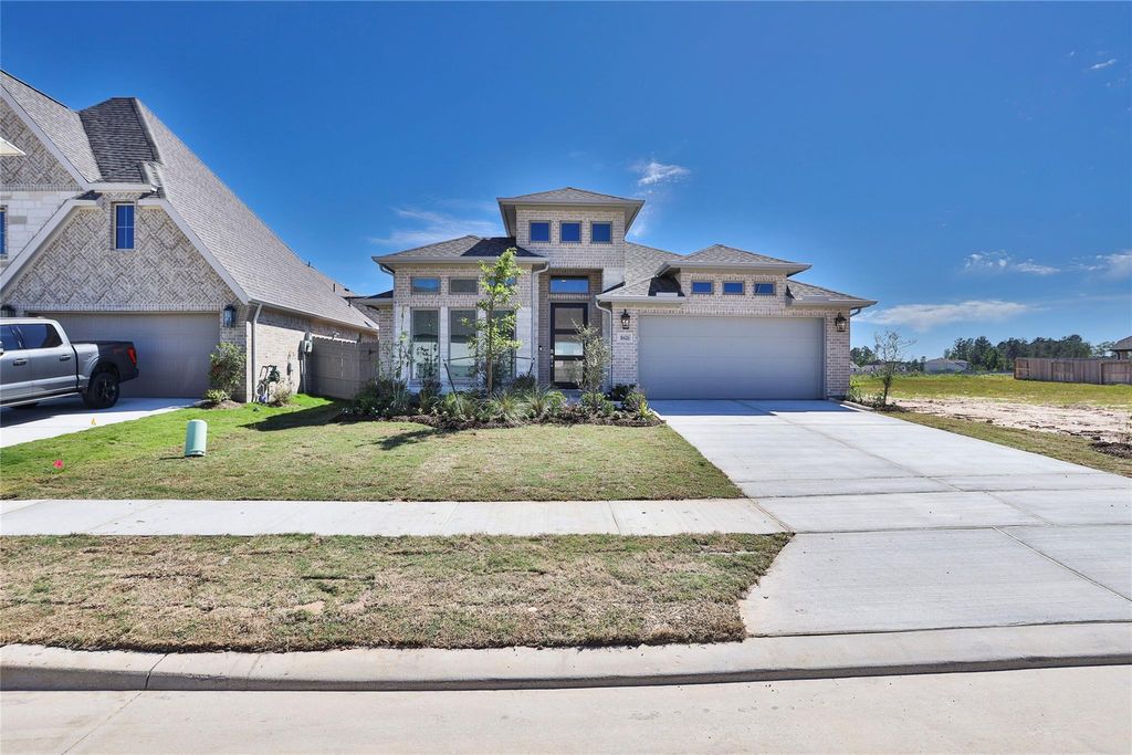 Extended entry highlights 12-foot coffered ceiling. Home office with French doors set at entry. Dining area flows into open family room with wall of windows and wood mantel fireplace. Open kitchen offers extra counter space, a 5-burner gas cooktop, corner walk-in pantry and generous island with built-in seating space. Spacious primary suite. Double doors lead to primary bath with dual vanities, a freestanding tub, separate glass-enclosed shower and two walk-in closets. Private guest suite with full bathroom and walk-in closet. All bedrooms include walk-in closets. Extended covered backyard patio. Mud room off two-car garage.