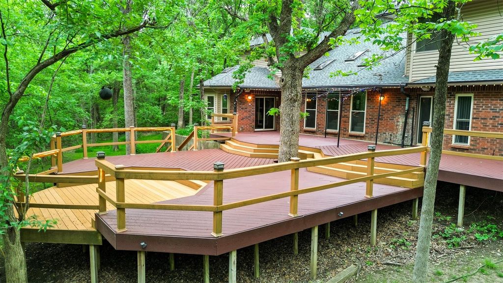 You know that feeling when you pull into Broken Bow? Windows down. Trees closing in overhead. Serene and untouched by municipal influence. Now imagine that — but you never left DFW. Sitting on 2.5 acres of the most heavily wooded, canopied land you'll find inside the metroplex, this home is something that simply doesn't come available in these parts. An enormous tiered deck spans the length of the house and hangs directly over a babbling creek. This is your backyard. Inside, a step-down living area framed by oversized windows and skylights immerses you in the tree line from every angle. The home doesn't compete with the outdoors — it invites it in. An updated kitchen delivers granite countertops, generous island and cabinet space, and room to spread out. The owner's suite features a slider that opens directly onto the rear deck, because even your morning routine should come with a view. The layout is intentional. Each room is its own space — defined, private, and purposeful. Upstairs, generously sized bedrooms flank a central game room, and an unfinished bonus room is ready to become whatever you need — an office, a gym, a fifth bedroom. From the spacious circle drive out front to the creek beneath the deck out back, every inch of this property is designed around one thing: drawing you outside. This isn't a home you commute back to. It's a home you escape to without ever leaving civilization. Rarely available. Impossible to replicate. Available now.