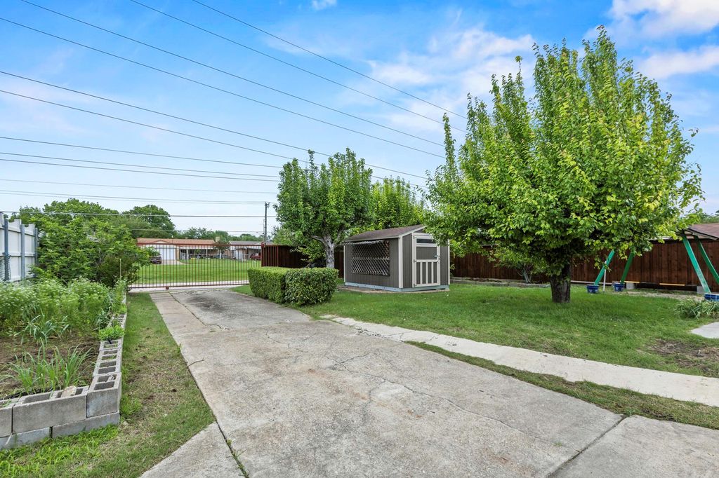 Beautiful one owner home on large corner lot! Spacious with over 3300 square ft of intentionally designed living space! Light and bright with high ceilings, 2 sky lights, upgraded lighting and energy efficient windows. Plantation shutters throughout provide natural light or privacy. Recently painted and move in ready! Floating ceramic tile throughout the house. Abundance of living areas with 4 bedrooms and additional multi-purpose rooms. Primary bedroom with walk-in closet. Primary bath with walk in jetted tub. 3 additional bedrooms. Bathroom with large walk in shower. Kitchen and bathrooms have granite countertops. Primary kitchen has double oven and lots of built in cabinets. Formal dining room that flows into an adjoining drop down living room for gatherings, entertaining and events. Two oversized additional living areas with gorgeous French doors between rooms. Elegant mantled wood burning fireplace. Large bonus room with large 2nd pantry for bulk shopping and space for office, play area or media room. In back of house there is a large 2nd cooking area with sink, stove, granite countertops and built in cabinets. Other features include 2 car covered carport, fully fenced backyard, private security gate (electric) across driveway at alley as well as house security system. Roof replaced 2018. Solar panels for electric efficiency. Sprinkler system (front yard only). Detached shed for lawn and garden supplies. Start your personal garden—there are 3 raised garden beds active with cilantro, garlic and bay leaves. Multiple trees including pear tree, fig tree and Japanese tree. Conveniently located close to 635, highways I-30 and 80. There is an abundance of shopping, restaurants and entertainment venues in close proximity. This home is unusually spacious and offers so many possibilities with the layout of rooms!