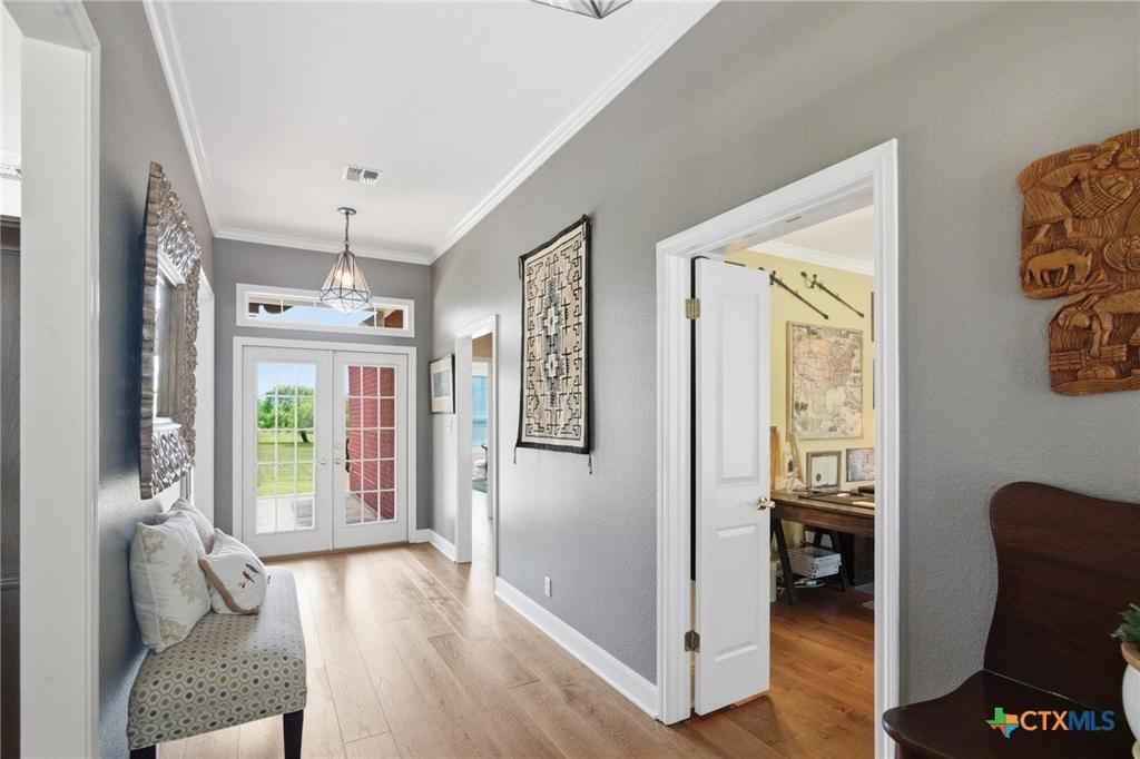 BuiltInFeatures, CeilingFans, CrownMolding, GraniteCounters, HighCeilings, HomeOffice, JettedTub, PrimaryDownstairs, MultipleLivingAreas, MainLevelPrimary, PullDownAtticStairs, StoneCounters, RecessedLighting, SplitBedrooms, SeparateShower, Vanity, NaturalWoodwork, WalkInClosets, BedroomOnMainLevel, CustomCabinets, FullBathOnMainLevel