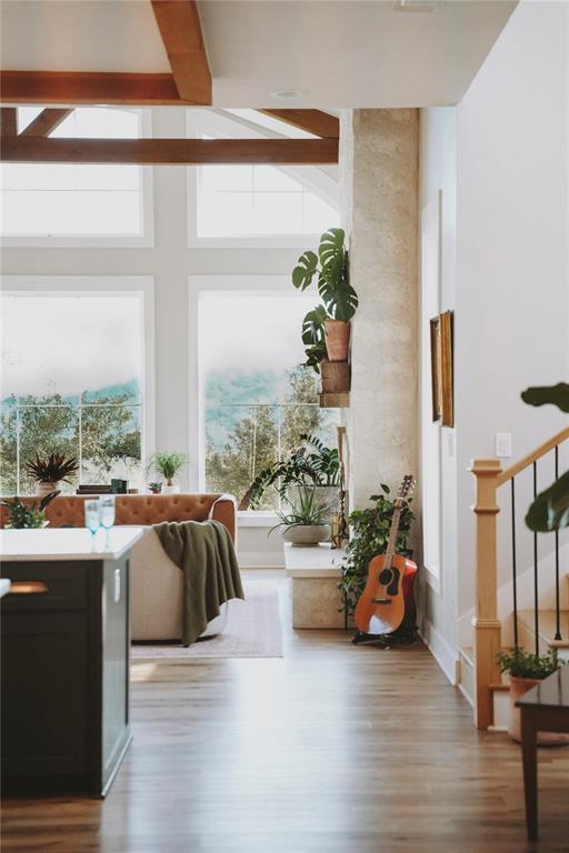 Built in 2022, the home was designed to capture light and breeze at every turn. The main living area opens with 20-foot ceilings and a wall of windows framing expansive views of the Wimberley Valley. Light shifts through the space from morning to evening, creating a home that feels both grounded and open.