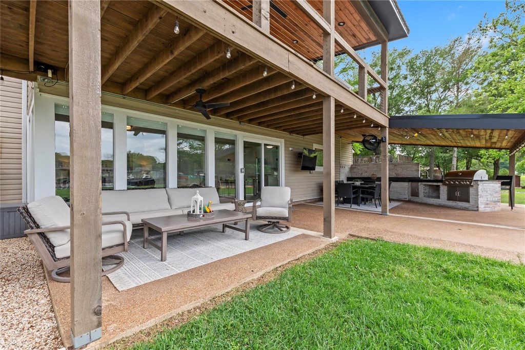 Positioned on a nearly half-acre (.483-acre) lot with 80’ of platted waterfront, this extensively updated lake home offers a like-new feel with an ideal blend of outdoor entertaining and indoor comfort. The covered waterside patio creates an exceptional outdoor living space with granite countertops, bar seating, sink, built-in grill, mounted TV, and a spacious dining area—perfect for hosting and enjoying lake days with family and friends. The oversized backyard offers plenty of room for games or future additions like a firepit, pickleball court, or pool (with HOA approval). A recently built composite boathouse features a boat slip, PWC lift, and spacious party deck—ready for summer entertaining and lakeside gatherings. Inside, large picture windows bring in natural light and water views. The open-concept design features shiplap ceilings, recessed lighting, a wood-burning fireplace, and durable luxury vinyl plank flooring throughout. The dining area connects to a well-appointed beverage bar with ice maker and beverage refrigerator and flows into the beautifully remodeled kitchen with shaker-style cabinetry, quartz countertops, stainless appliances, and breakfast area. The lower level includes an expansive bunkroom and a full bath with dual-sink vanity, tiled walk-in shower, and a laundry area with cabinetry and a granite folding counter. The waterside primary suite offers a private balcony with cedar beams, modern cable railing, and exterior stair access to the patio. The spa-like en suite bath features a soaking tub, walk-in tile shower, and modern fixtures and finishes throughout. Upstairs are two additional bedrooms connected by an updated Jack-and-Jill bath with stylish tilework and a walk-in shower. Recent improvements include a newer roof, skylights, added insulation, and drainage updates. A dedicated water toy and tool shed provides convenient storage, while the long driveway and covered parking offer ample space for guests.