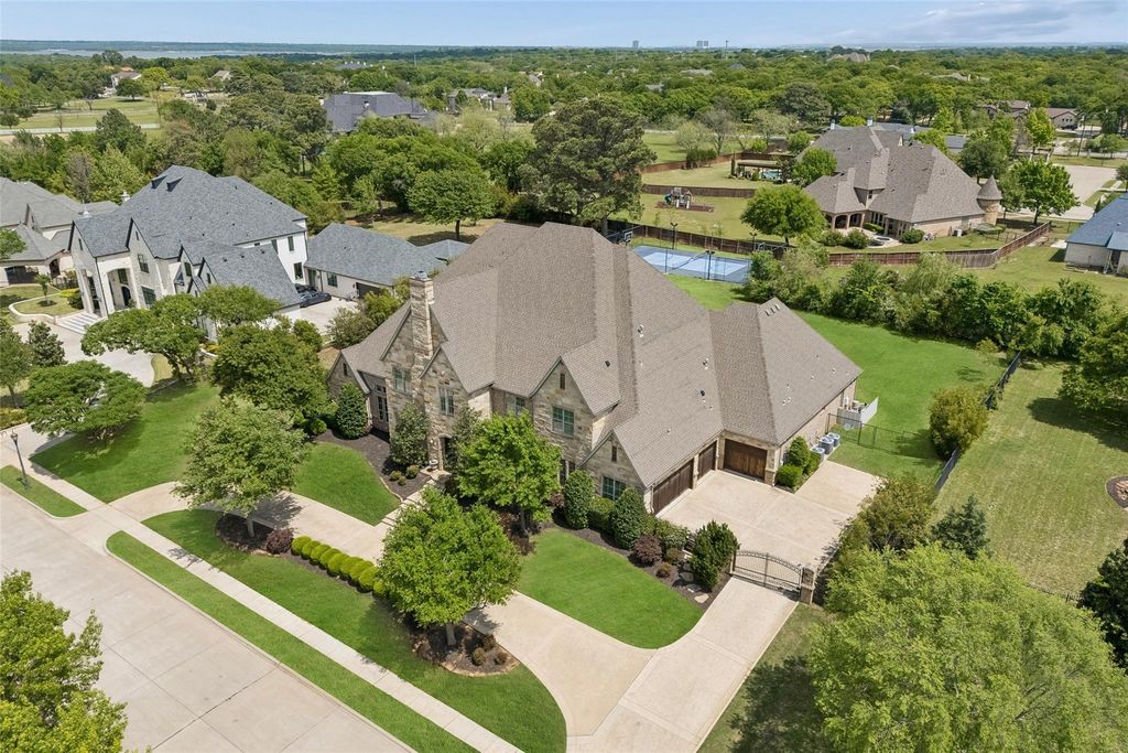 Exquisite craftsmanship & timeless elegance define this extraordinary Hatfield Custom Home, gracefully situated on a sprawling 1 acre estate in the prestigious St. Emilion community of Southlake. From the moment you step through the grand entry, you are welcomed by soaring ceilings, rich hardwood flooring & an atmosphere of refined luxury. Designed for both intimate living & grand-scale entertaining, the home offers an impressive formal dining room & an elegant formal living space adorned with a statement chandelier, a warm fireplace & plantation-shuttered windows that bathe the room in natural light. A distinguished executive study showcases coffered ceilings, custom built-ins & exquisite wood wainscoting. The main living area is nothing short of breathtaking, featuring vaulted, beamed ceilings & a dramatic floor-to-ceiling stone fireplace, seamlessly blending indoor & outdoor living w-sliding doors that open to the resort-style backyard. The gourmet chef’s kitchen is a true showpiece, appointed w-a grand island, built-in fridge, gas cooktop, double ovens, and a fully equipped butler’s pantry, crafted to impress & perform. Primary suite is a luxurious retreat, complete w-a serene sitting area + a spa-inspired bath offering a jetted soaking tub, dual vanities & a custom WIC. The home continues to impress with a 1st floor game room featuring a wet bar, a fully equipped media room w-theater seating & an additional upstairs game room w-its own Juliet balcony + generously sized guest suites. Every detail has been thoughtfully curated, including a spacious utility room with an oversized island & abundant storage, an exercise room, a wine cellar & a well-appointed guest suite on the main level. Step outside to your private resort oasis, where a covered patio with a stone fireplace & outdoor kitchen overlooks a sparkling pool & spa with a dramatic rock waterfall. The expansive grounds also feature a sport court and ample green space, all complemented by a 4 car garage.