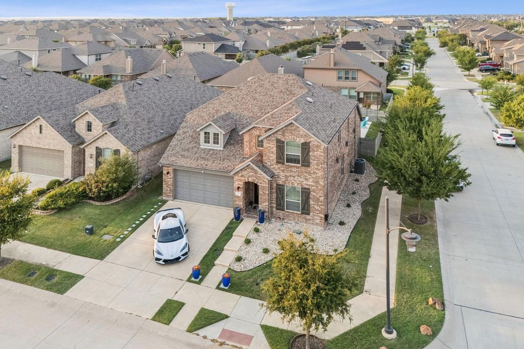 Discover luxury living at its finest in Argyles' most desirable neighborhood, Harvest! With updates valued over $200k this meticulously maintained 4-bedroom, 3-bath Highland Home home offers the perfect blend of elegance, comfort, and functionality. From the moment you arrive, the professionally landscaped yard and impressive curb appeal set the tone for what’s inside. Step into a light-filled foyer that opens to a formal dining room and a spacious living room with soaring ceilings. Throughout the home, you’ll find designer touches and finishes. The chef’s kitchen is a true showstopper, featuring sleek cabinetry with hardware, granite countertops, center island, stainless steel appliances, a gas cooktop range and modern lighting. Retreat to the luxurious primary suite with a spa-inspired ensuite bath with double vanities, a large walk in shower and a generous walk-in closet. Upstairs, enjoy a large game room and an additional adjacent living area and two bedrooms, plus full bathroom. Step outside to your own private resort-style paradise. A custom-built covered patio overlooks a stunning salt water heated pool with a mesmerizing waterfall feature, and a Texas-sized roofed patio with outdoor counter, storage cabinets and built in gas grill. Surrounded by low maintenance landscaping, LED color changing patio lighting and enclosed by a wood fence, this backyard oasis offers the ultimate in privacy and tranquility—perfect for hosting lively gatherings or enjoying peaceful evenings. Additional features include a storage shed and numerous upgrades: 2022 Tankless water heater, 2021 SALT WATER Pool, 2020 Deck masters double covered Patio Roof, 2022 RainSoft whole house water softner system, 2021 Outdoor kitchen area with gas grill. Zoned to Argyle ISD this exceptional home truly has it all! Community amenities include a scenic lake with kayaking and fishing, parks, neighborhood pools, coffee shops and more!