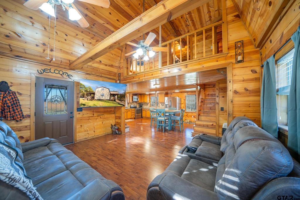 Cozy Cabin Retreat on 8 Acres. Escape to this charming 2-bedroom, 1-bath cabin, perfectly set on 8 beautifully manicured acres with a small, serene pond tucked in the woods. A gated pipe-fenced entrance welcomes you to this peaceful oasis, complete with fenced and cross-fenced areas, ideal for pets or livestock. The open-concept living, dining, and kitchen area boasts modern touches, including stainless steel appliances, granite countertops, and a spacious tile shower with matching granite vanity. Both bedrooms are located upstairs and feature a walk-in closet, offering comfort and practicality. Step out onto the back covered deck to relax while overlooking the sunken above-ground swimming pool and expansive backyard