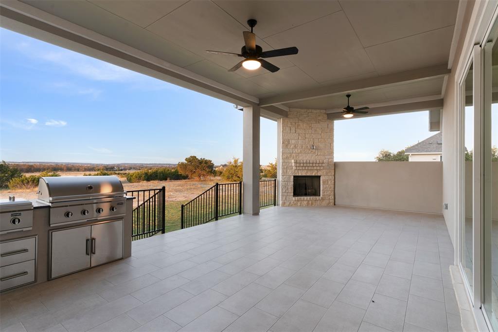 The primary suite is tucked on the main floor and offers a private retreat with a spa-inspired bathroom that includes dual sinks with a linen cabinet, a shower room with a soaking tub, and a spacious walk-in closet connected directly to the utility room for added convenience. The covered patio with an outdoor fireplace extends the living space, creating a comfortable area for outdoor relaxation.