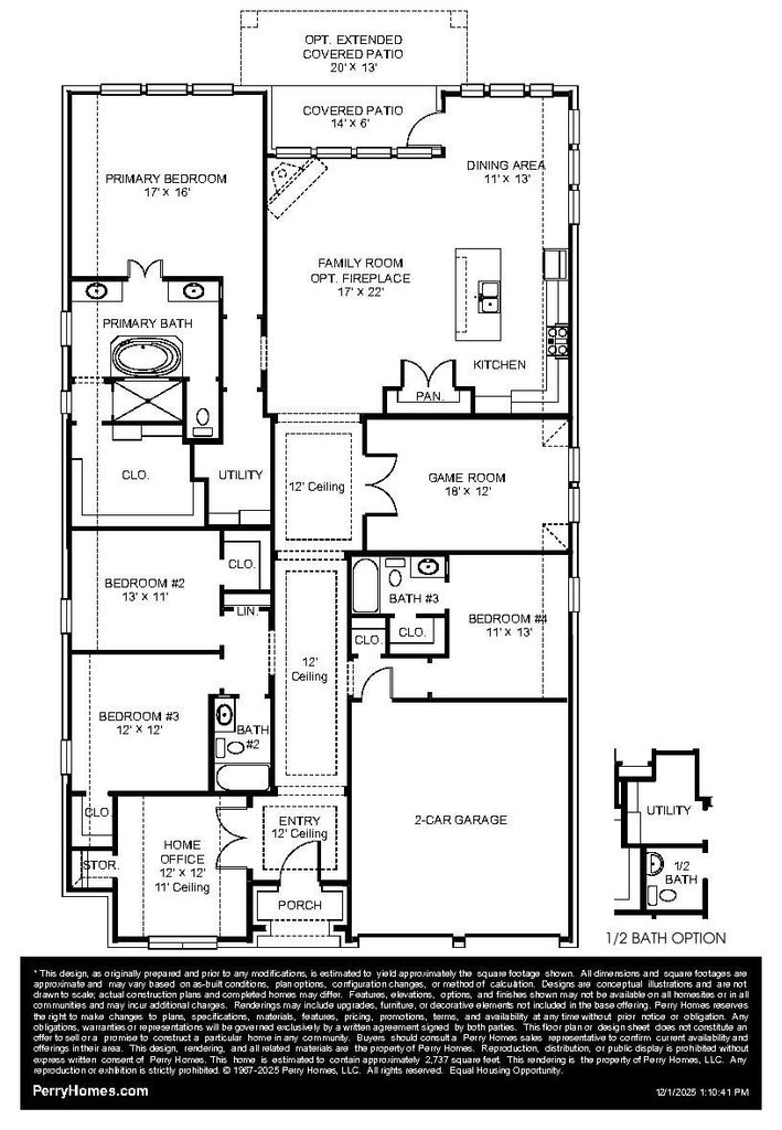 Home office with French doors set at entry with 12-foot ceiling. Game room with French doors off extended entry. Family room with wall of windows opens to kitchen and dining area. Kitchen features walk-in pantry and generous island with built-in seating space. Primary suite includes bedroom with wall of windows. Double doors lead to primary bath with dual vanities, garden tub, separate glass-enclosed shower and oversized walk-in closet. A guest suite with private bath adds to this four-bedroom home. Covered backyard patio. Two-car garage.