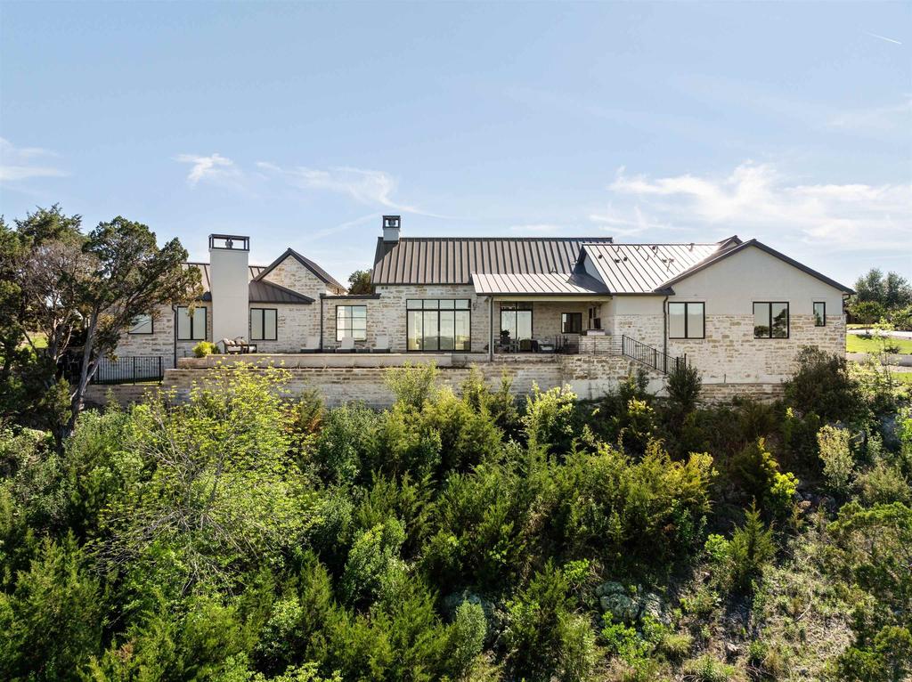 Panoramic Sandy Creek and Lake Travis views define this contemporary ranch-style home in Ranchland Hills, designed by award-winning architect Elliot Johnson and built by Richard Bright Custom Homes. Offering three bedrooms, three full bathrooms, and a dedicated office, the home features Lincoln wood windows, a slurry stone exterior, and a Legacy custom steel entryway. Vaulted ceilings with exposed beams, white oak flooring, and a floor-to-ceiling stone fireplace anchor the main living space. The kitchen includes an oversized island with prep sink, quartz countertops, Thermador appliances, and custom cabinetry. The primary suite features a stone fireplace, custom walk-in closet, and oversized walk-in shower. Outdoor living includes a custom pool and hot tub, outdoor kitchen, artificial turf, and manicured native landscaping. Additional features include metal seam roof, full security system, reverse osmosis system, and three-car garage with epoxy flooring.