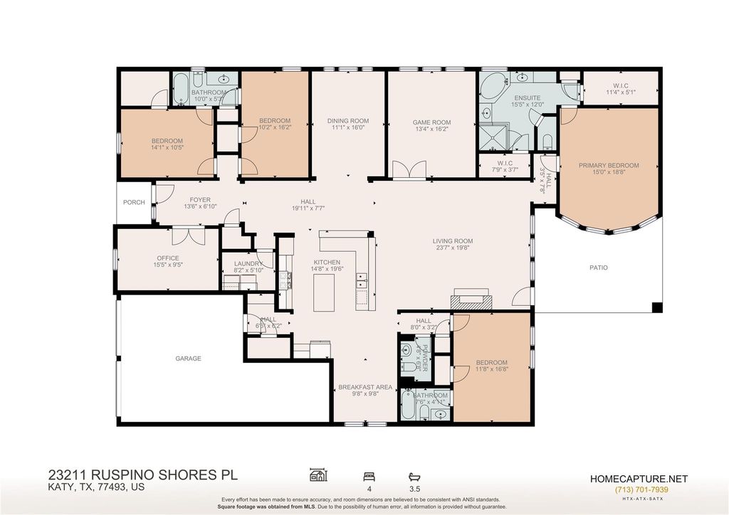23211 Ruspino Shores Pl is listed for sale at $ 519,990. The Single-Family property has 4 bedrooms, 3 Full Bathrooms, 1 Half Bathroom, 3484 square feet and was built in 2014. The lot size is 8125 Square feet. ##BR##Welcome home to 23211 Ruspino Shores Place in the community of Ventana Lakes and zoned to Katy ISD! This stunning one-story home offers 4 bedrooms, 3.5 baths, a private office, and a spacious game room with no backyard neighbors and peaceful lake views. Upon entry you are greeted by an inviting foyer leading to the private study. The open-concept layout seamlessly connects the kitchen, dining, and family room, making entertaining effortless. The kitchen features ample cabinetry, a large island, and generous counter space overlooking the bright living area with oversized windows. The primary suite includes a spa-like bath with dual sinks, soaking tub, separate shower, and walk-in closet. Secondary bedrooms are well-sized and thoughtfully positioned for privacy. Enjoy the covered patio and tranquil waterfront setting, perfect for relaxing or hosting guests.