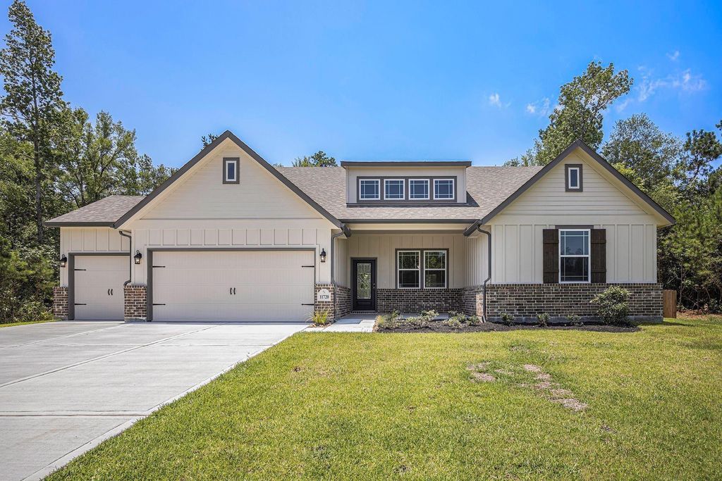 Experience country living with modern luxury in this beautiful one-story farmhouse in one of Conroe’s top acreage communities. Sitting on nearly an acre, this 2,492 sq ft home offers 4 bedrooms, 2.5 baths, and a 3-car garage. The open floor plan features high ceilings, a stone fireplace, and a gourmet kitchen with white cabinets, quartz countertops, stainless steel appliances, a farmhouse sink, and an oversized island. RevWood laminate floors flow throughout, with carpet in the bedrooms for added comfort. The private primary suite includes a soaking tub, walk-in shower, and dual vanities. Enjoy the spacious covered patio with room for a shop, RV, or boat. Located in Willis ISD with a low tax rate and just minutes from I-45 and Lake Conroe, this home offers the perfect mix of elegance, space, and convenience.