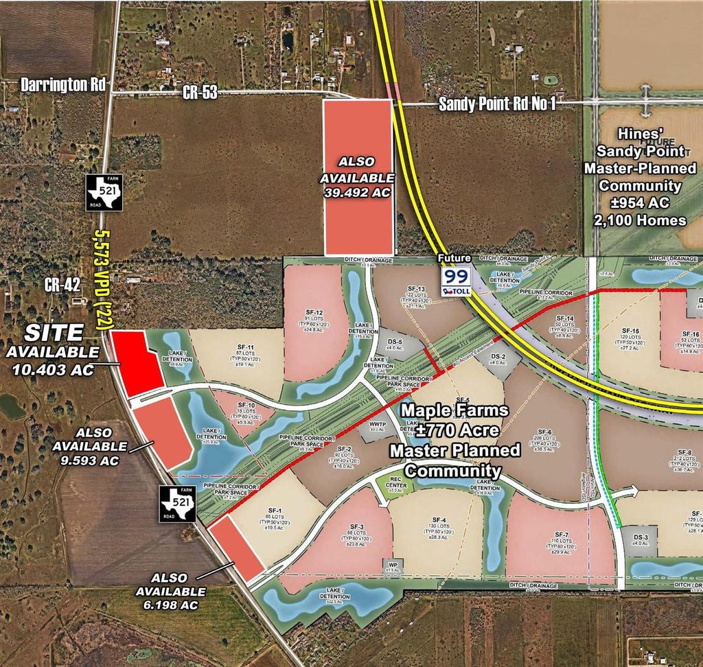 PROPERTY HIGHLIGHTS: • Hard Corner Reserve at the NE corner of FM 521 and the proposed main entrance to a +/-700 Ac Master Planned Community development with 1,700+ homes • Adjacent to Hines’ proposed ±954 AC Master Planned Community development with 2,100+ homes • Development Agreement in place with the adjacent community developer for infrastructure (public water/ sewer/off-site drainage, cross access, etc), allowing these reserves to be easily entitled at little to no cost • 963’ of frontage on FM 521 • Txdot has major road improvements planned in the area with FM 521 to be widened, SH 288 widening under way, and plans for segments B&C of 99 Grand Parkway finally progressing forward • No flood plain per FEMA Map Will Divide