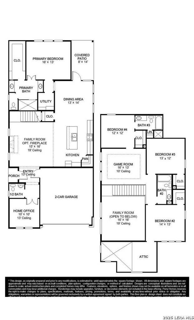 Enter through the side porch into a split entryway, where a private home office awaits behind French doors on one side, while the family room beckons with its impressive 19-foot ceiling on the other. The kitchen features an island with built-in seating and a corner walk-in pantry, seamlessly connecting to the adjacent dining area which boasts a wall of windows, offering ample natural light. Tucked away off the main living areas, the utility room adds convenience to daily tasks. The primary bedroom is a serene retreat, featuring a wall of windows for abundant natural light. French doors lead to the primary bathroom, complete with dual vanities, a glass-enclosed shower, and a spacious walk-in closet. Upstairs, discover a versatile game room with its own wall of windows. A private guest suite awaits, offering comfort and privacy with a full bathroom, walk-in closet, and linen closet. Additional secondary bedrooms, each with walk-in closets, share a well-appointed bathroom and offer attic