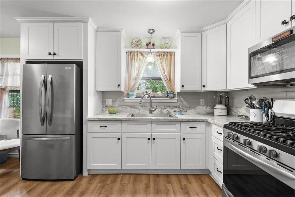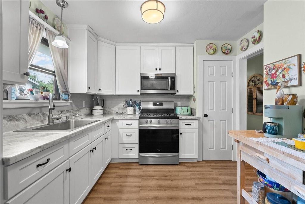 Move in Ready! LIKE NEW HOME! Completely renovated and remodeled TOP TO BOTTOM! NEW ROOF on house and shed (2024), HVAC w/warranty (2021), HOT WATER HEATER (2021), NEW FENCE (2023), NEW ELECTRICAL SYSTEM with new fixtures, recessed lights, and outlets (2022), GARAGE DOOR SPRINGS (2024), plus NEW GUTTERS & LANDSCAPING (2024). Inside, you’ll love the ADORABLE KITCHEN featuring NEW CUSTOM CABINETS, QUARTZ COUNTERTOPS (2022), backsplash, and STAINLESS STEEL GAS STOVE, MICROWAVE & REFRIGERATOR. The home also boasts NEW VINYL PLANK FLOORING (2022) throughout and NEW BATHROOM (2022) with new vanity, bathtub/shower, and toilet. Step out back to a PARK-LIKE SETTING with a “she shed”/garden shed and a covered patio—perfect for BBQs or relaxing evenings. Bonus: TWO refrigerators + washer & dryer (2022) INCLUDED!** Seller is willing to include furniture with acceptable offer!