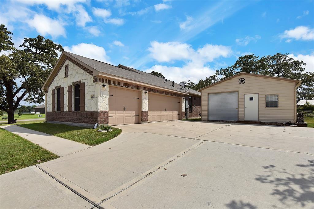 LOW taxes, no MUD, 1.04 acres! Welcome to your one story upgraded and upscale country home on a little over an acre with a three car garage and shop with large established oak trees. This four bedroom home has a split floor plan for privacy of primary bedroom to secondary bedrooms. Boasts large main family/dining/kitchen and breakfast bar all open concept, great for family gatherings and entertaining. Primary shower is huge with ADA access, recent oversize quartz counter top in kitchen. Recent light fixtures and fans throughout. Fantastic use of square footage with many builder upgrades, NO CARPET!! Beautiful ceramic wood look tiled floors throughout. Large 20' X 24' covered back porch with all the connections for an outdoor kitchen. Shop and extra covered parking approx. 1,000', foam insulated, split AC unit and ceiling fans & door openers. 11 zone sprinkler system over the 1+ acre. Three rail fence with mesh and 3 gates. Buyer to verify room sizes. More info and pictures soon.