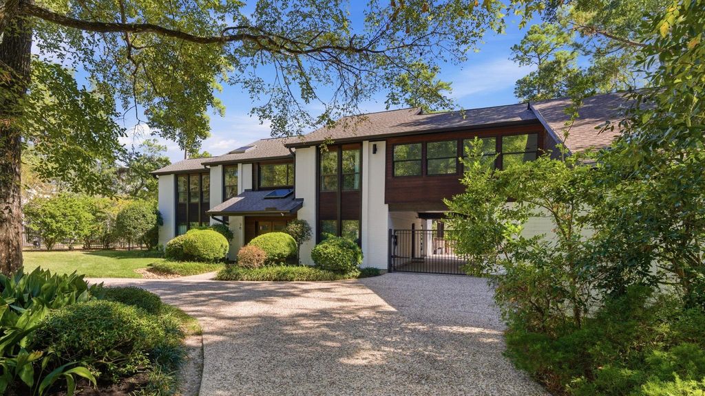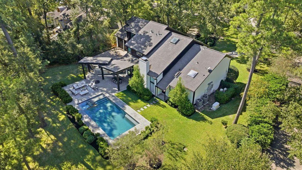 LOCATION & a quiet cul-de-sac W/ NO REAR NEIGHBORS & WATER VIEW! A mid-century modern residence sits on a sprawling lot overlooking a prominent stretch of Lake Woodlands & highlights an OVERSIZED 5-CAR GARAGE. Thoughtfully renovated, this home has been reimagined to enhance natural light & create seamless flow throughout. Wide-plank oak flooring anchors the main level. A beautiful chef’s kitchen opens to the family room & breakfast area, appointed W/ professional-grade appliances. Soaring ceilings complement throughout, while retractable glass doors open to the pool/spa, outdoor kitchen, & beautifully landscaped grounds w/ tranquil water views. The primary suite has 3 closets, in-suite laundry, & updated bath; first-floor study offers built-in storage & natural light. Upstairs: 4 bedrooms, play loft; large game room w/balcony, & an oversized laundry. GENERATOR! Kayak to Hughes Landing, bike to Market Street & The Pavilion. Minutes to Bush IAH, renowned medical care, shopping & dining!