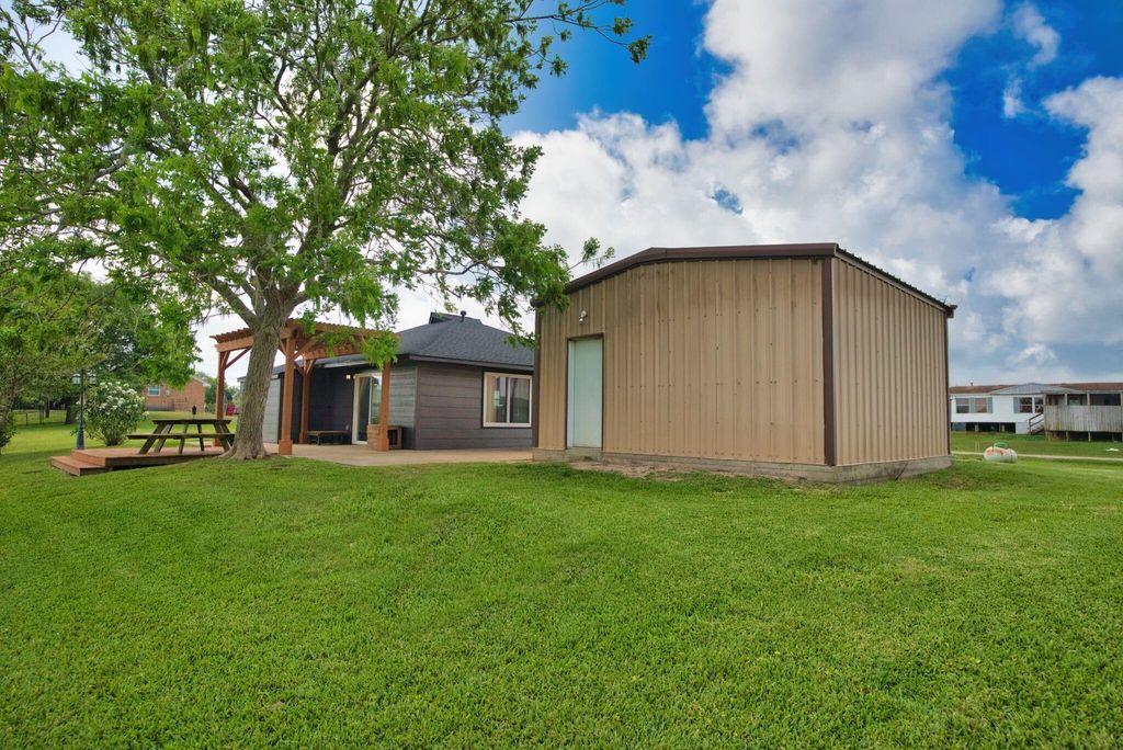 Looking for a weekend get-away or fulltime residence? Here's a quaint & cozy waterfront home on the canal off the San Bernard River on a 110' wide double lot. The interior was remodeled in 2019 including kitchen cabinets & granite counters, and a beverage cooler, tile flooring throughout, & all new windows. Recent updates include new roof in 2026 and exterior repainted. Outdoors features a 20 x 20 metal building with shelving, electrical outlets w/one being a 240 volt- 50 amp breaker. To the left of the building is approx. 35' wide area to park a boat. To the right is a concrete driveway between the home & building and back around to the patio with a Pergola cover with party lights to relax & enjoy day & night. Great views of the amazing full moon & all the stars! At the water's edge is a long pier with a metal boat lift designed for a 21' boat, covered fish cleaning station with sink, & light. The canal is perfect for kayaking & exploring all the way to the river. This is a must see!