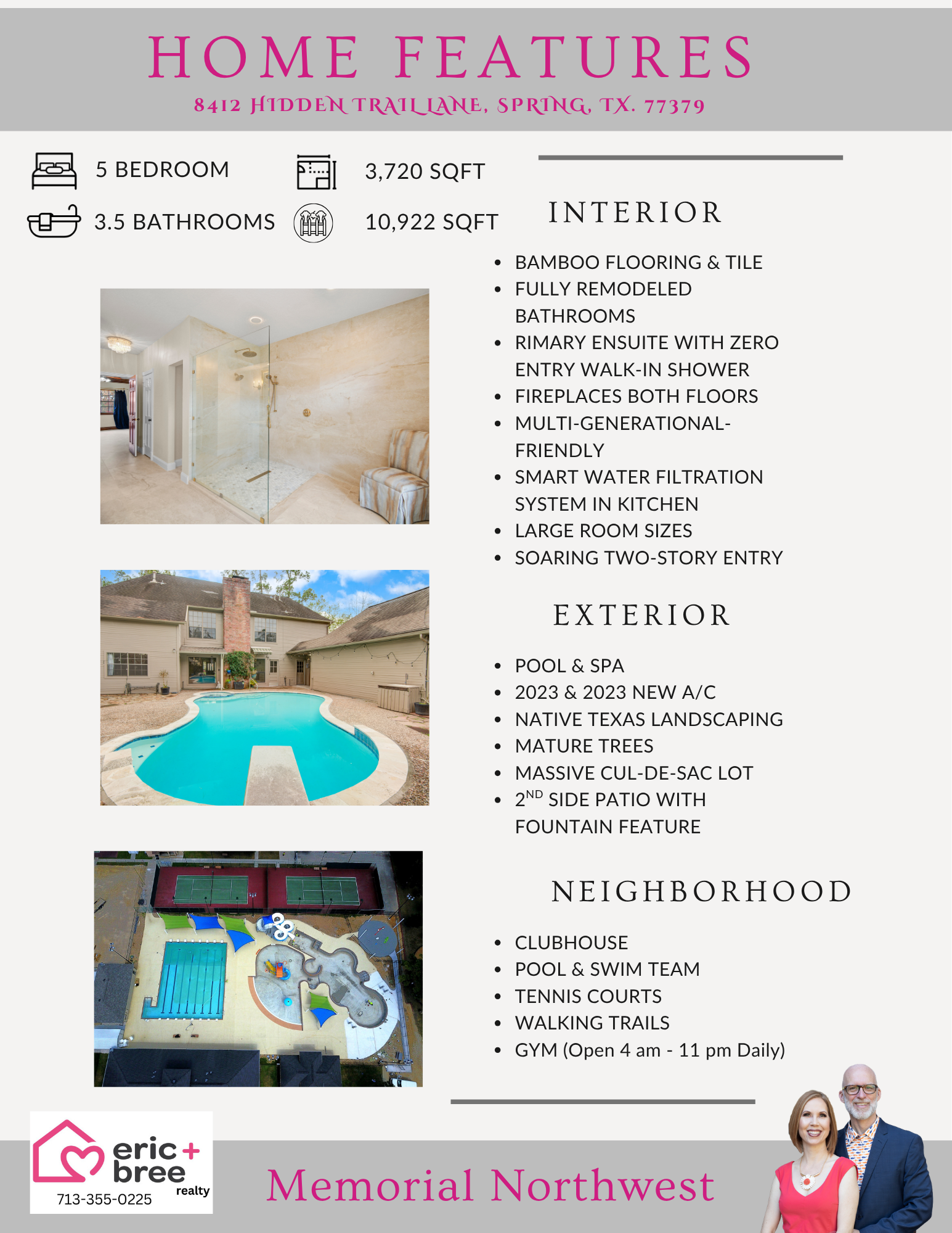 8412 Hidden Trail Ln is listed for sale at $ 550,000. The Single-Family property has 5 bedrooms, 3 Full Bathrooms, 1 Half Bathroom, 3720 square feet and was built in 1983. The lot size is 10922 Square feet. ##BR##* FULLY REMODELED BATHROOMS * 2024 and 2023 A/C * This majestic, family-friendly cul-de-sac home with 5-beds and 3.5-baths, plus a Pool and Spa!! Step into a massive 2-story foyer open to the formal dining room and family room with rich wood paneling and cozy fireplace flanked by windows, and peaceful backyard views. The kitchen has plenty of storage and large breakfast nook overlooking a side patio, perfect for coffee or cocktails. First floor owner’s retreat features a remodeled ensuite with massive open walk-in shower, dual sinks and closets. Upstairs find a great game room with fireplace, 4 spacious bedrooms, and 2 shared bathrooms, one with a walk-in shower and the other with a soaking tub. Generous closet space throughout the home for everyday convenience. Outdoors, enjoy a private pool and spa. Neighborhood amenities include a community pool, fitness center, tennis courts, and jogging trail. Home is Multi-Generational friendly and also Wheelchair Accessible! * SMART WATER FILTRATION *