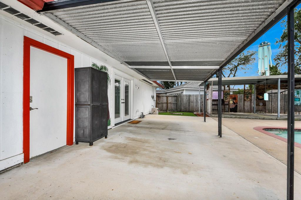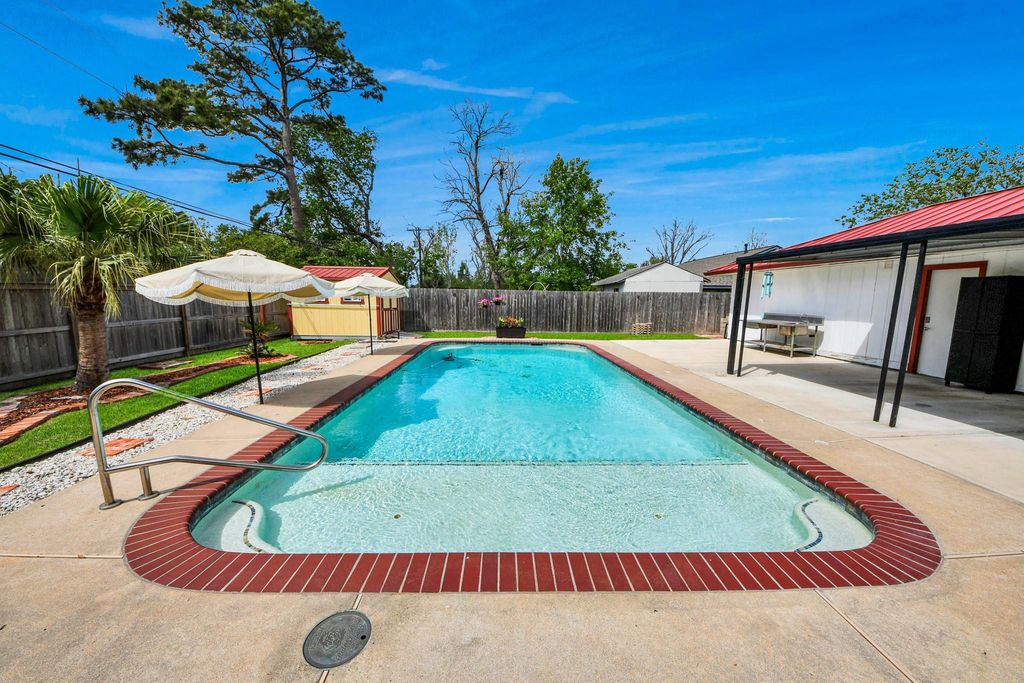 Welcome to this charming home in League City! This well-maintained property features updates like a metal roof, storm windows, PEX plumbing, and more. With 4 bedrooms, 2 bathrooms, it's the perfect place to make memories. Enjoy the convenience of no HOA dues, proximity to I-45, and being just 30 min. away from Galveston and Houston. The kitchen boasts soft close cabinets, under cabinet lighting, the new appliances were put in when kitchen was remodeled. The living area has beautiful Porcelain tile, Vinyl plank flooring in the bedrooms. Fall in love with the windows in this home, owner spared no cost when choosing the Storm Windows, no more boarding the window before a storm! Stop by and fall in love with your new backyard outdoor living space. Your private oasis awaits, relax in a resort-style pool, 6 water features, 6 umbrella holes, 4 are on pool deck, 2 are in the pool on water deck. . A covered patio, along with a 10X20 covered deck. Family, Friends and Amazing Memories await!
