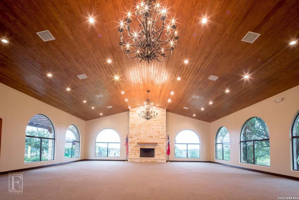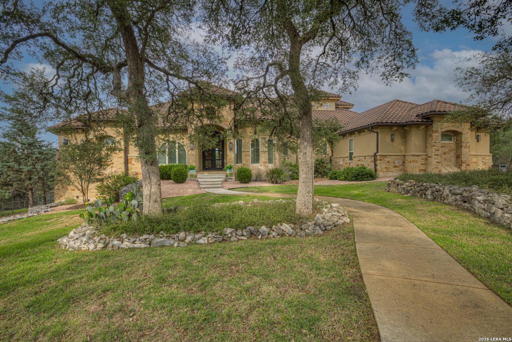 Situated on approximately 4.45 acres in Vintage Oaks, this two-story residence offers 4 bedrooms and 4.5 bathrooms with Hill Country views and a private setting. The main living area features high ceilings, a floor-to-ceiling stone fireplace, and expansive windows that bring in natural light and showcase the surrounding landscape. The kitchen is designed with a Wolf gas range, custom cabinetry, and generous counter space, opening seamlessly to the living area for both daily living and entertaining. The floor plan includes well-appointed bedrooms with en-suite bathrooms, along with an upstairs media room featuring a balcony overlooking the main living space below. Outdoor living is a key component of the home, with a covered patio that includes a built-in grill, fireplace, and multiple areas for seating while taking in the views.