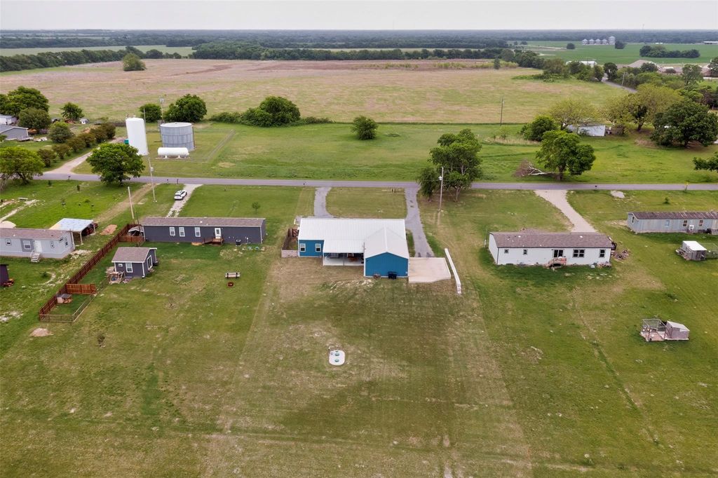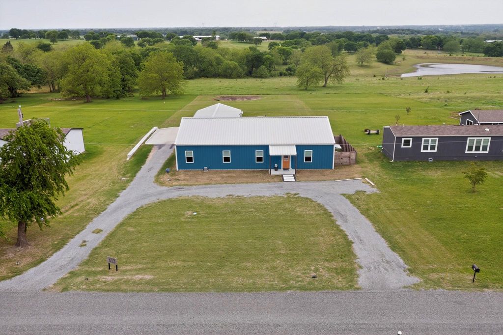 Welcome to this stunning 2024-built barndominium where modern design meets country living on a full acre—offering space, style, and functionality just minutes from Sherman and the new Texas Instruments campus. This thoughtfully designed home features 4 bedrooms, 3 bathrooms, and a dedicated study, all finished with durable concrete floors throughout for a sleek, low-maintenance lifestyle. The open-concept layout is anchored by a chef-inspired kitchen showcasing granite countertops, an oversized island, a deep granite sink, soft-close cabinetry, and an extra-large walk-in pantry—perfect for both everyday living and entertaining. The primary suite is a true retreat, featuring luxurious quartzite countertops, an oversized walk-in shower, and a unique private door leading directly to the outdoor dog run—blending convenience with thoughtful design. Secondary bathrooms elevate comfort with marble countertops and spray foam-insulated tubs designed to keep water hot for up to 2 hours. Step outside to enjoy the covered back patio, accessible from both the living area and garage, where you can unwind and take in breathtaking sunset views overlooking your private acre with a dry pond. Additional highlights include built-in blinds in exterior doors, a backyard sprinkler system, and a septic system. Car enthusiasts and tech-forward buyers will appreciate the oversized 2-car garage with 9-foot wide doors, pre-wired for an electric vehicle, and ample storage throughout—including walk-in closets in secondary bedrooms. This property delivers the perfect balance of modern comfort, thoughtful upgrades, and peaceful outdoor living—all in a prime location with convenient access to major growth and development.