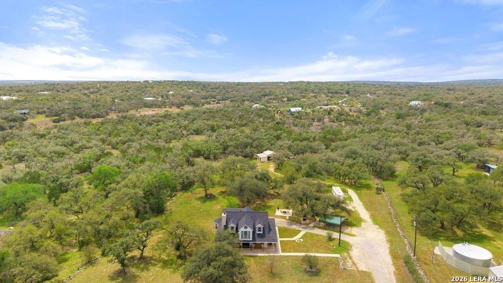 Beautiful Texas Hill Country retreat on 6.58 acres in the highly desirable Summer Mountain Ranch community. This inviting two-story home offers 3 bedrooms, 2.5 baths, and 2,381 square feet of thoughtfully designed living space surrounded by scenic countryside and mature trees. Relax with morning coffee or sip on a glass of wine at sunset on the expansive wraparound porch while taking in sweeping Hill Country views. Inside, a stunning limestone fireplace anchors the spacious open-concept living and dining areas, creating a warm and welcoming gathering space. The main-level primary suite offers privacy and comfort, complete with a sitting area or home office. Upstairs features two additional bedrooms with vaulted ceilings, a full bath, and an open loft type area that can be used for an additional game or living room, and an enclosed sunroom with a view is perfect for reading, plants, hobbies, or additional flex space. Outdoor amenities include a detached garage with two spaces, covered p