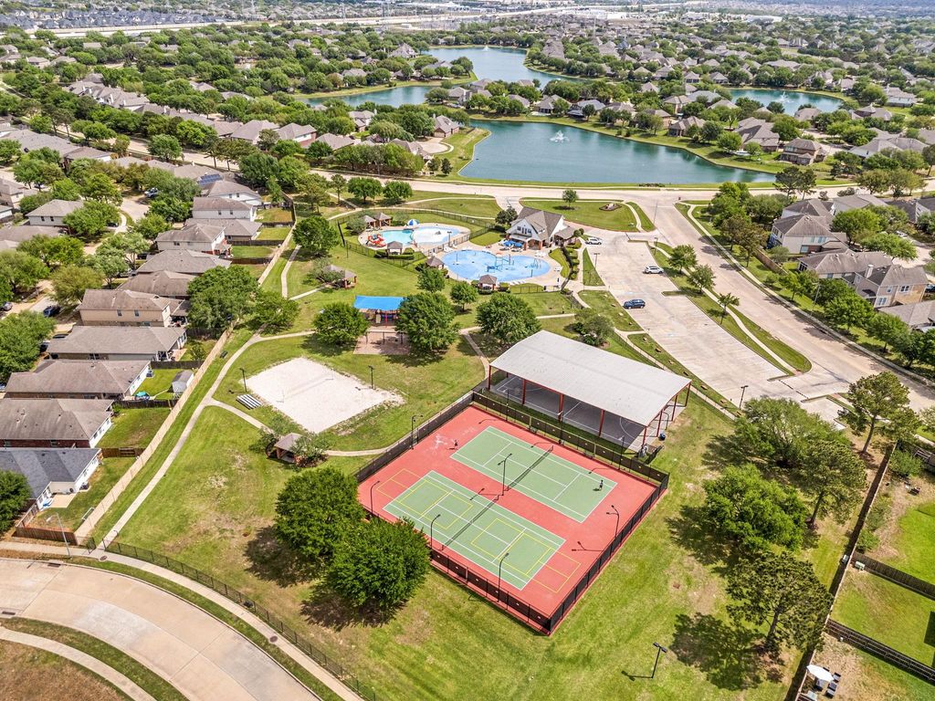 Beautiful LAKEVIEW home in gated Westheimer Lakes with 5 beds & 3.5 baths. Brick exterior with wrought iron fencing, welcomes you into a functional layout with formal dining and a versatile flex space ideal for a home office. Living room showcases a cozy fireplace, wet bar, & large windows framing serene lake views. Open-concept kitchen offers quartz countertops, center island, stainless steel appliances, breakfast area, & abundant cabinetry. First floor includes two beds, including the primary suite with patio access, dual sinks, soaking tub, separate shower, and walk-in closet, plus a half bath for guests. Upstairs, a spacious game room & 3 secondary beds, including a Jack-and-Jill bath & an additional full bath. Enjoy a covered patio overlooking the lake—perfect for your outdoor activities. Community amenities include pool, splash pad, clubhouse, playground, and sports courts. Easy access to Grand Parkway(TX-99), Westpark Tollway, & FM 1093 with nearby shopping and dining. LOW TAX