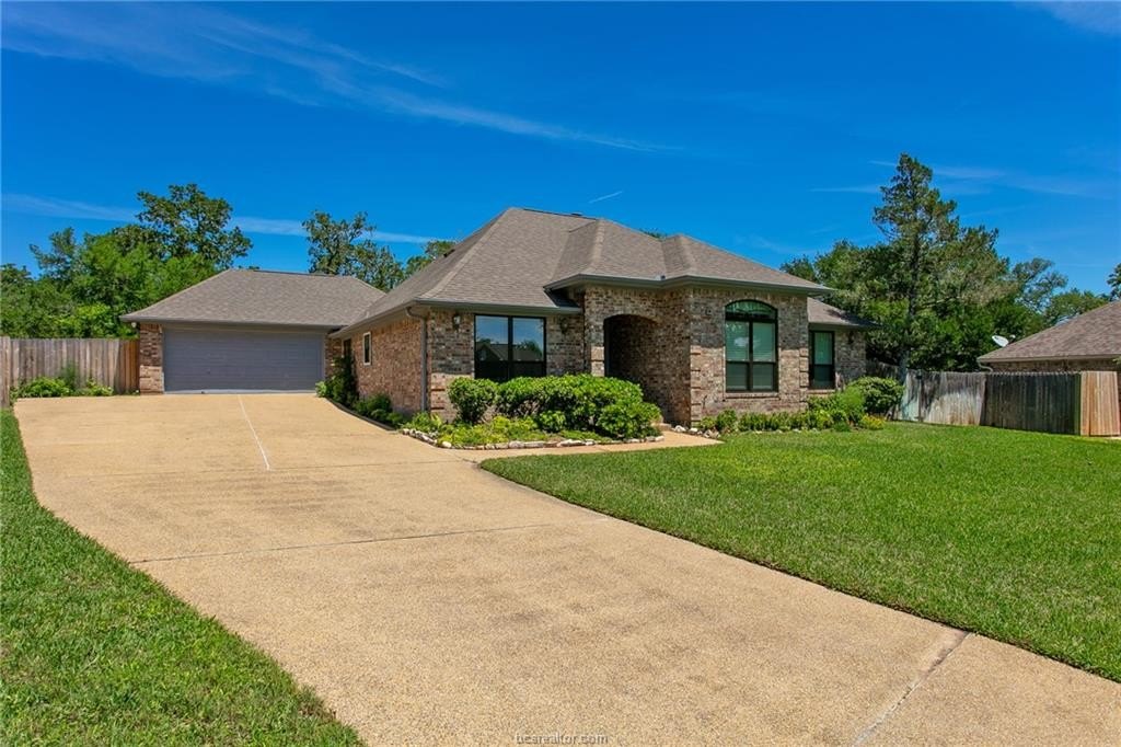 Beautifully maintained 3-bed, 2.5-bath home tucked at the end of a peaceful cul-de-sac on a spacious, wooded lot in sought-after Pebble Creek. Classic brick-and-stone exterior with arched entry and manicured landscaping welcomes you inside to gleaming hardwood floors, soaring ceilings, and elegant crown molding. The spacious living room features a wall of windows, French door to the patio, fireplace, and custom oak built-ins. A separate formal dining room with tray ceiling adds elegance. The generous kitchen offers abundant oak cabinetry, gas cooktop, large pantry, built-in desk nook, and a bright breakfast area. The private primary suite boasts a tray ceiling, jetted garden tub, separate shower, double vanity, and expansive walk-in closet with built-in shelving. Two additional bedrooms and a full bath with double vanity complete the thoughtful floor plan. Step outside to a covered patio overlooking a shaded, privacy-fenced backyard backing to mature trees - a rare private retreat. Minutes to Pebble Creek Country Club golf course, tennis, pool, and walking trails. Short drive to Texas A&M, top-rated CSISD schools, shopping, and dining.