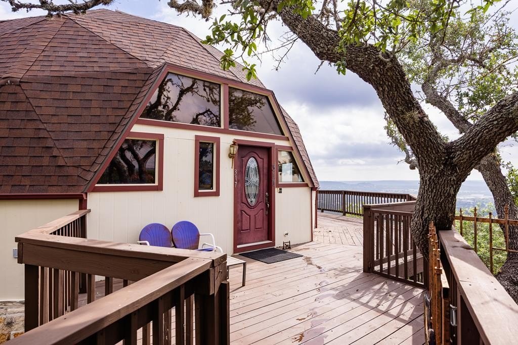 Some homes are built, this one was imagined. Perched above the rolling Hill Country this house is a home for the rare buyer who sees architecture as art and incredible views as a daily blessing. If that''s you, welcome home. Iconic, energy-efficient, and unmistakably unique. Curved walls, an open floor plan, and a flowing sense of space create an environment that simply feels different from the moment you step inside. At 2,424 square feet across 2 bedrooms and 3 bathrooms, there is room to live expansively while staying connected to the beauty surrounding you. Step onto the deck and let the Texas Hill Country do what it does best. Sweeping, unobstructed vistas stretch across the landscape in a panorama that changes with every season, every sunrise, and every storm rolling in. This is the kind of view people drive hours to see - and you''ll wake up to it every day. A striking rock fireplace anchors the open-concept main level, where the family room, dining area, and breakfast bar flow together naturally - ideal for intimate gatherings or quiet evenings by the fire. Raised planter beds and several areas to put your lawn furniture. There is even a bathroom accessible from the garden.