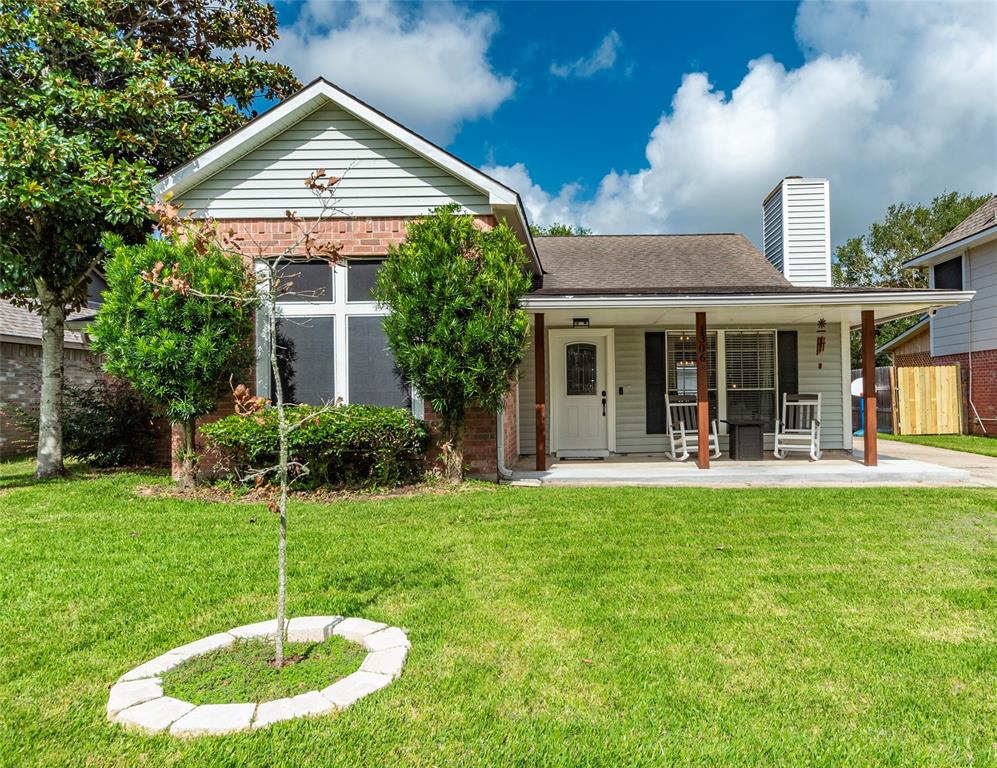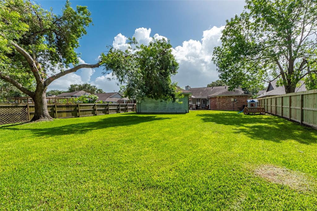 Beautifully Updated 4/2/2 Home on Oversized 11,151-sf Lot featuring mature trees, privacy & access to back green space! Well-maintained home in Rustic Oaks subdivision shows pride of ownership featuring New Roof w/ 8" Gutters in 2018, Pex Plumbing in '21, Blown-in Green Fiber Insulation in '21, extended Front Porch w/ Cedar Posts in '23, 10x12 Storage Shed in '24 & Luxury Vinyl Floors in '21. Stunning Kitchen Remodel in 2021 features Quartz countertops, Honeycomb Backsplash, Farmer's Sink w/ upscale Faucet, Soft-close Cabinets/Drawers, Recessed Lights & Wood beams. Stunning dark Stainless Steel Appliances in 2020 w/ 5-Burner Gas Range, Microwave, Dishwasher & Side-by-Side Refrigerator. Home offers fresh paint, 2" blinds & crown molding! Fireplace & Formal dining w/ Edison-bulb fixture. Spacious primary bedroom 12' soaring ceilings & large windows. Primary bath w/ Framed Mirrors, tub/shower combo PLUS separate shower. Additional 3 bedrooms & 2nd bath w/ double sinks! Covered back patio!