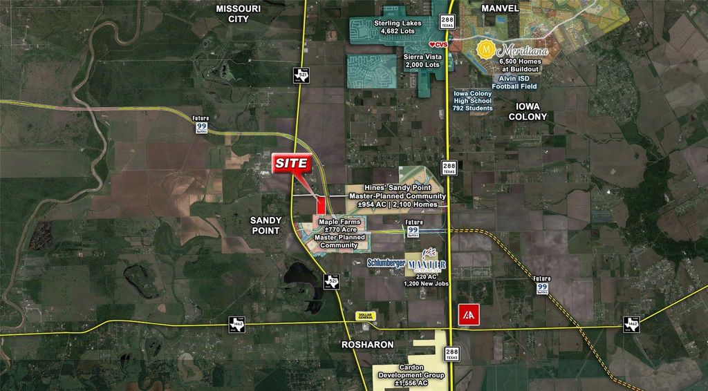 PROPERTY HIGHLIGHTS: • Future proposed Hard Corner at the SW corner 99 Grand Parkway and CR 53 • At a future proposed entrance to a +/-700 Ac Master Planned Community development with 1,700+ homes • Adjacent to Hines’ proposed ±954 AC Master Planned Community development with 2,100+ homes • Development Agreement in place with the adjacent community developer for water/sewer/drainage, cross access, etc, allowing these reserves to be easily entitled • 870’ on CR 53 and undetermined on 99 Grand Parkway • Txdot has major road improvements planned in the area with FM 521 to be widened, SH 288 widening under way, and plans for segments B&C of 99 Grand Parkway finally progressing forward. CR 53 is also proposed to be widened and will be the main thoroughfare connecting FM 521 to 288 through the Hine’s Development. It is highly likely there will be an on/off ramp for CR 53 on 99 Grand Parkway • No flood plain per FEMA Map • WILL DIVIDE