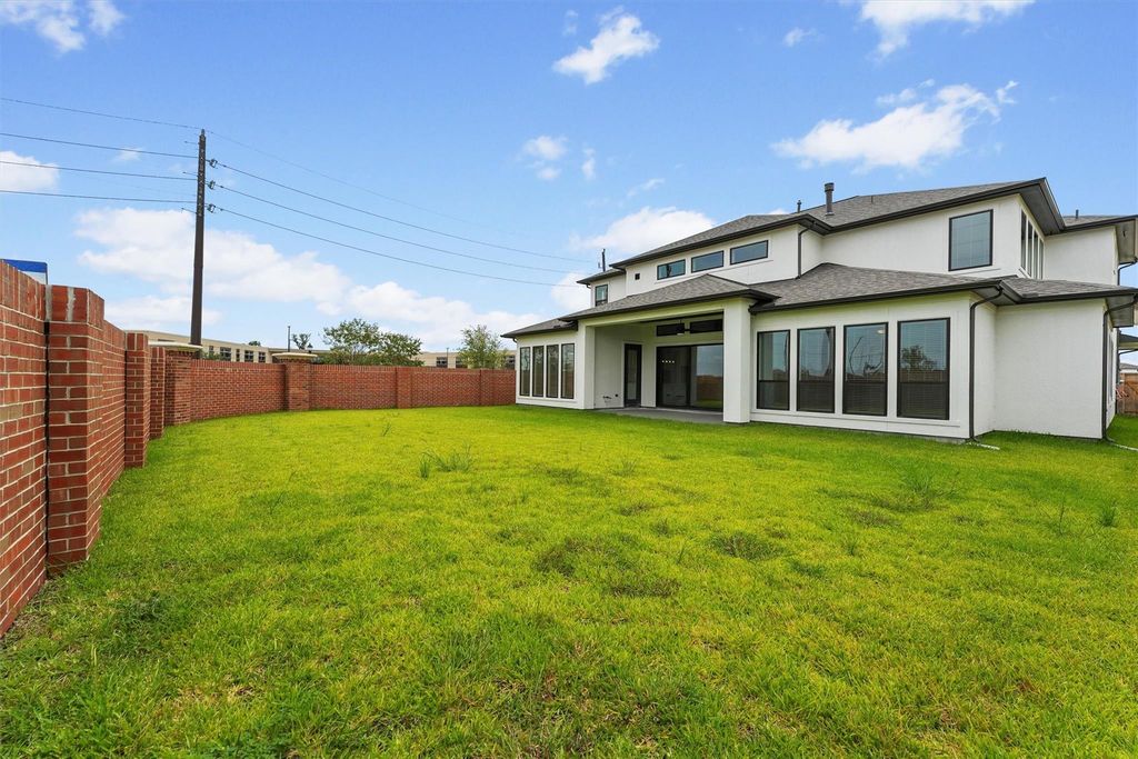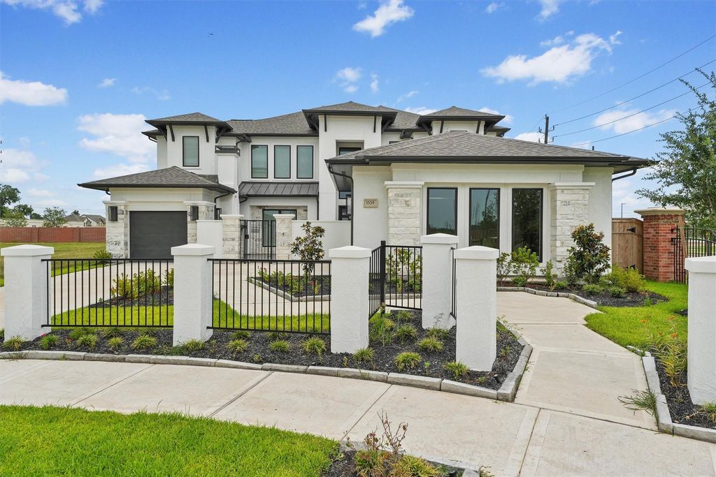 Private courtyard. Front porch leads to welcoming two-story entry with 20-foot ceilings framed by a home office with French doors and a circular staircase. Two-story family room with soaring 21-foot ceiling features a fireplace and a wall of windows. Island kitchen with built-in seating space offers a generous walk-in pantry and a butler's pantry that leads to the formal dining room. Morning area with a curved wall of windows just off the kitchen. Private primary suite with a curved wall of windows. Primary bathroom features a French door entry, dual vanities, garden tub, separate glass enclosed shower, linen closet and two walk-in closets. Guest suite with a full bathroom and walk-in closet downstairs. Second floor features additional guest suites with full bathrooms, a game room with a wall of windows and a media room. This beautiful home is no more than a 1 min walk from the elementary school making going to school safe, and convenient