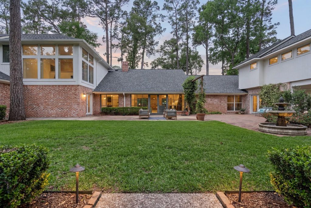 Set on one of the most exceptional lots in Hunters Creek Village, this architecturally reimagined home blends privacy, design, and modern livability. Positioned on a prominent corner at the entrance to Tara Oaks, it is surrounded by mature pines, oaks, magnolias, and seasonal blooms. Offered for only the second time since 1969, the home has been thoughtfully enhanced over 23 years, creating a warm, functional living environment. The backyard is a private retreat with treetop views, fountain, and lush landscaping, with room for a future pool. Elevated on Flint River Drive for excellent drainage, the home was reimagined by architect Bjørn Sefeldt with high ceilings, abundant light, and a flexible floorplan. Main living spaces open seamlessly to outdoor areas, ideal for entertaining. Distinctive features include a reclaimed brick fireplace, custom kitchen finishes, 2023 cabinetry updates, new roof (2026), updated windows (2025), and energy-efficient improvements.