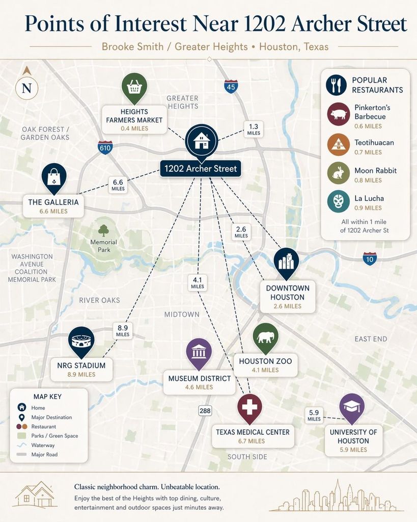 Situated in the Houston Heights on a low-traffic, no-through street, this meticulously crafted residence blends timeless character with modern luxury and privacy. Thoughtful details include custom millwork, a metal standing-seam roof, chef’s kitchen, cocktail bar, and home theater. Imported Carrara marble accents the kitchen island, bar, and baths, while the primary suite offers a spa-like retreat with soaking tub, Toto bidet, and private balcony. Over $30K in recent upgrades include interior repainting, refinished pinewood floors and historic details throughout. An additional 400 sq. ft. detached studio apartment adds flexibility with fiber-optic connectivity, private bath, walk-in closet, and storage. Conveniently located near Downtown, walking distance to nature parks, the Galleria, and the Texas Medical Center. HOME NEVER FLOODED. Schedule your private tour today!